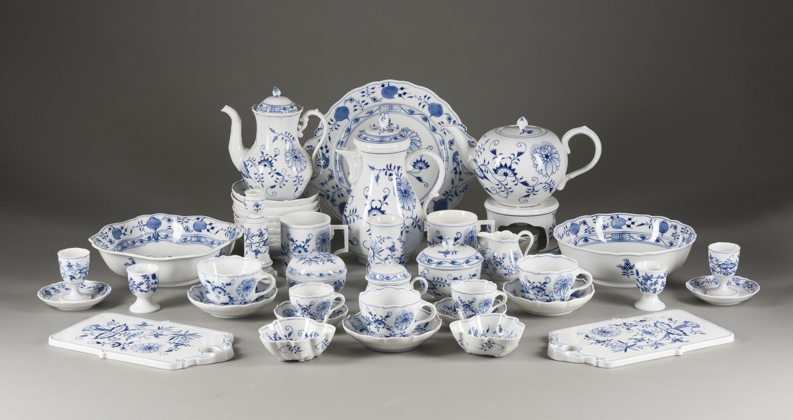 Porzellan, Blaumalerei. L. 52 cm (Platte), D. 26,5 cm (Henkelplatte). Unterglasurblaue Schwertermarke (auch Knaufschwerter), Press- und Malernummer. Bestehend aus: 5 Suppentellern, 18 Speisetellern, 15 Frühstückstellern, 1 Terrine, 2