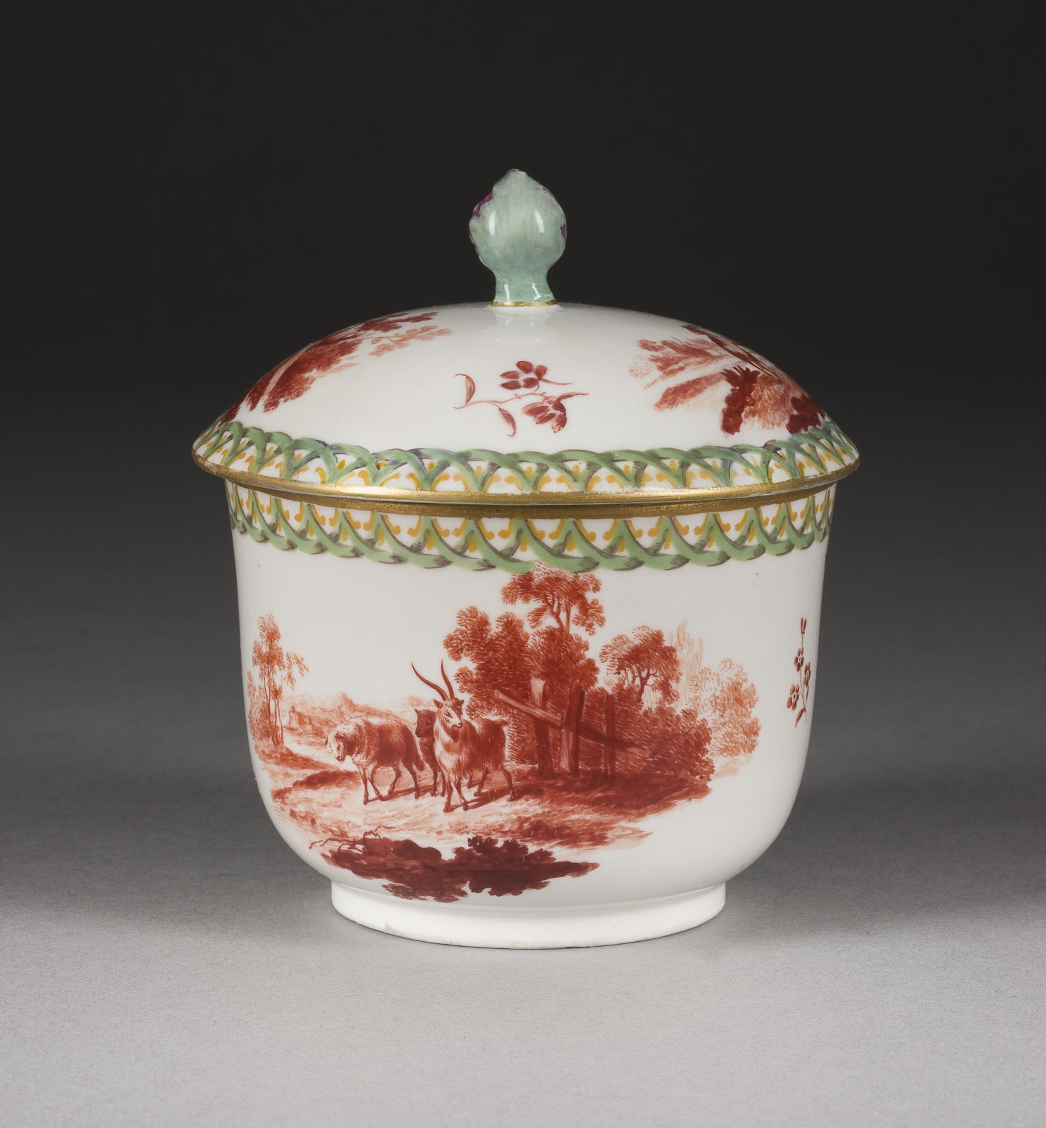 Porzellan, polychrome Malerei und Camaieumalerei in Eisenrot. H. 10,5 cm. Unterglasurblaue Carl-Theodor-Marke unter Krone, Ritzzeichen. Deckel rest., Gebrauchsspuren.