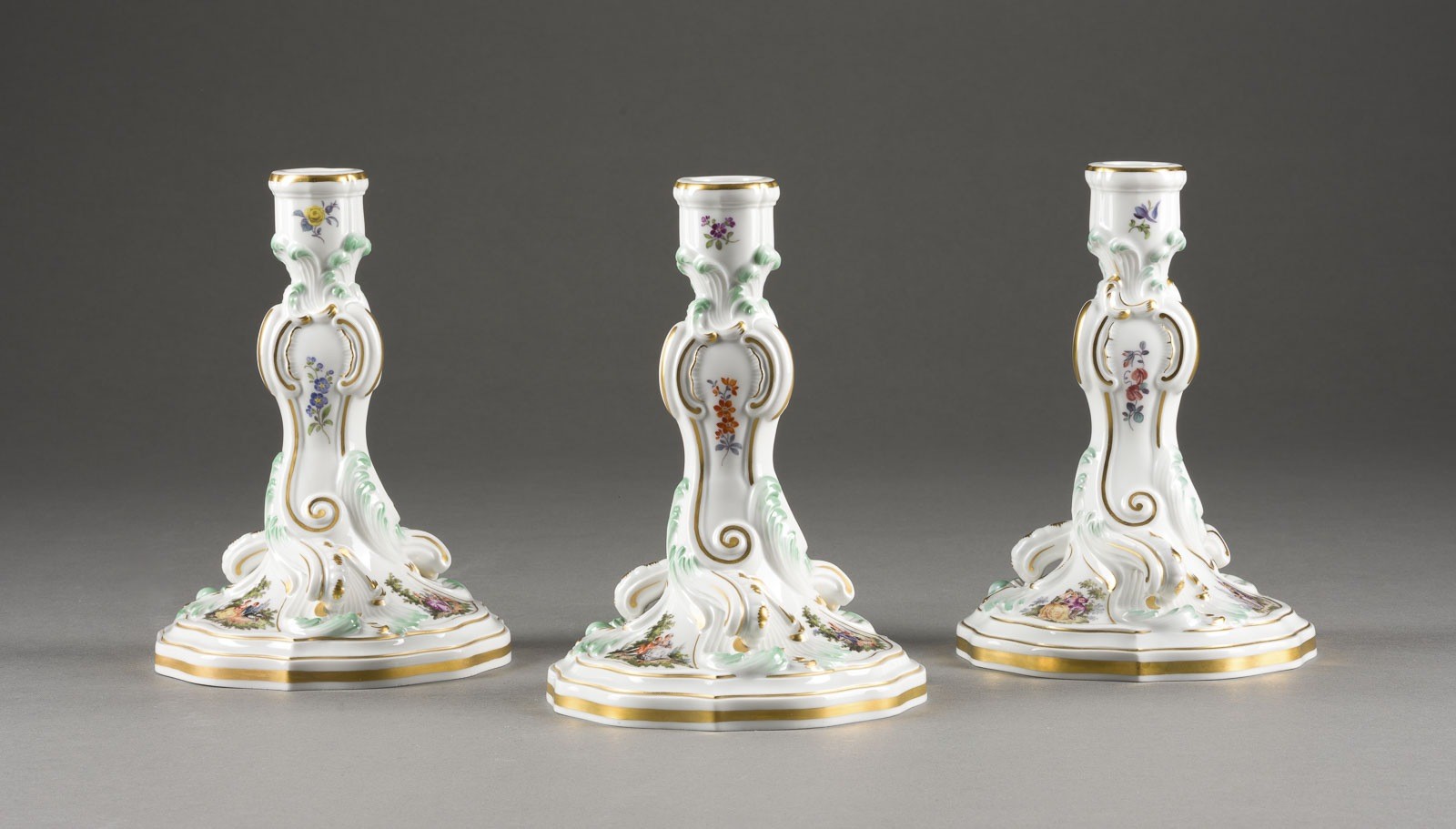 DREI KERZENHALTER 'WATTEAU- UND BLUMENMALEREI'