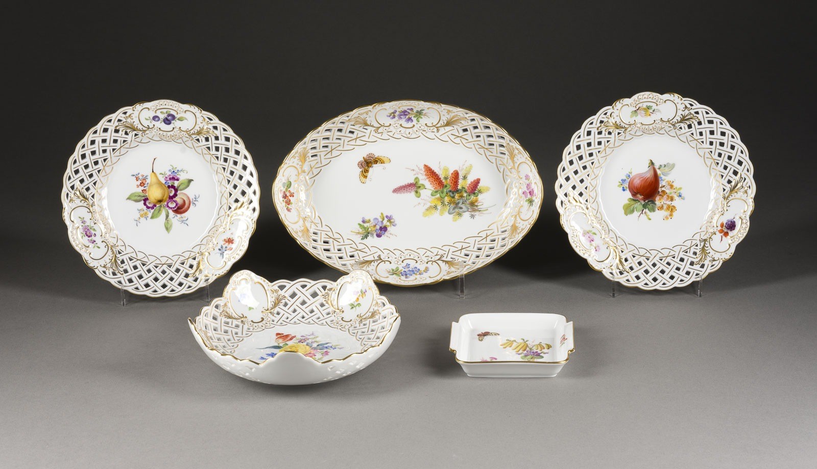 Porzellan, polychrome Malerei, Goldstaffage. L. 25 cm (Durchbruchschale), D. 18 cm (Teller). Unterglasurblaue Schwertermarke, Press- und Malernummer, part. Jahreszeichen und Modellnr. Bestehend aus: 2 Durchbruchschalen, 2 Durchbruchtellern, 1 Schale. 1. Wahl und ein Durchbruchteller 2. Wahl.