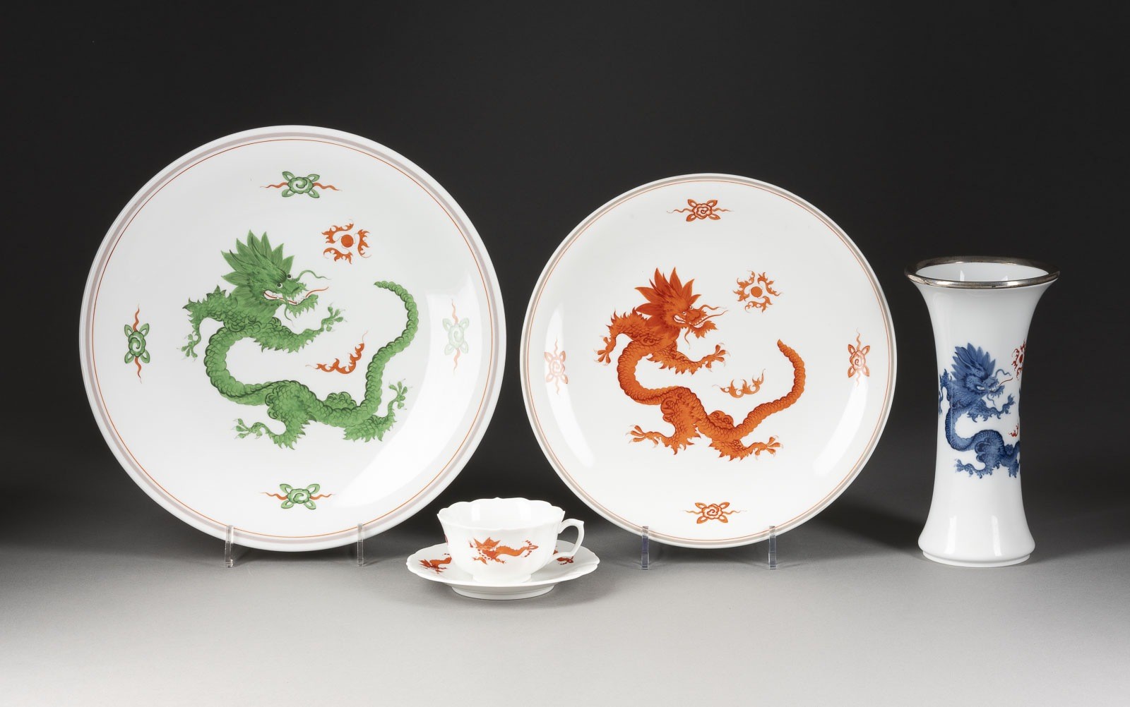 Porzellan, Camaieumalerei in Blau, Grün, Rot, part. Silbermontierung. D. 30,2-34,5 cm, H. 23,6 cm. Unterglasurblaue Schwertermarke, Press- und Malernummer, Modellnr. Inschrift: 'Offiziers-Preisschießen Bautzen September 1932'. Bestehend aus: 2 gr. Tellern,