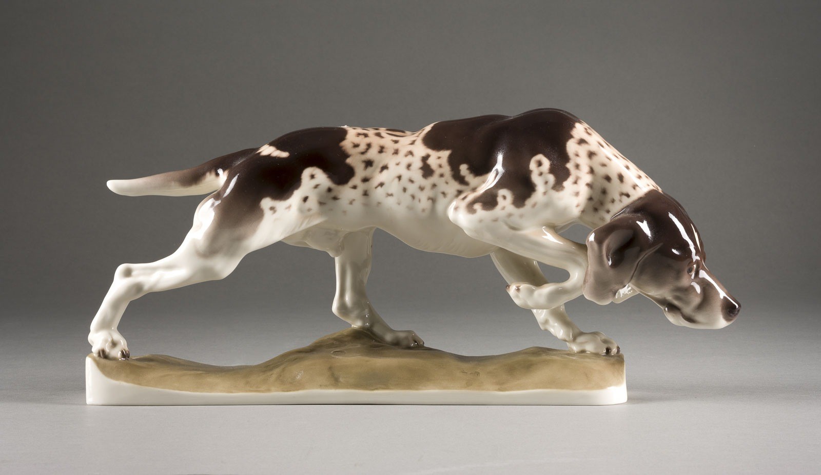 Porzellan, polychrome Malerei. L. 42 cm. Grüner Manufakturstempel, 'Western Germany', im Boden und am Sockel eingepresstes Rautenschild, Modellnr. '160/4'. Bez. 'H. Behrens'.