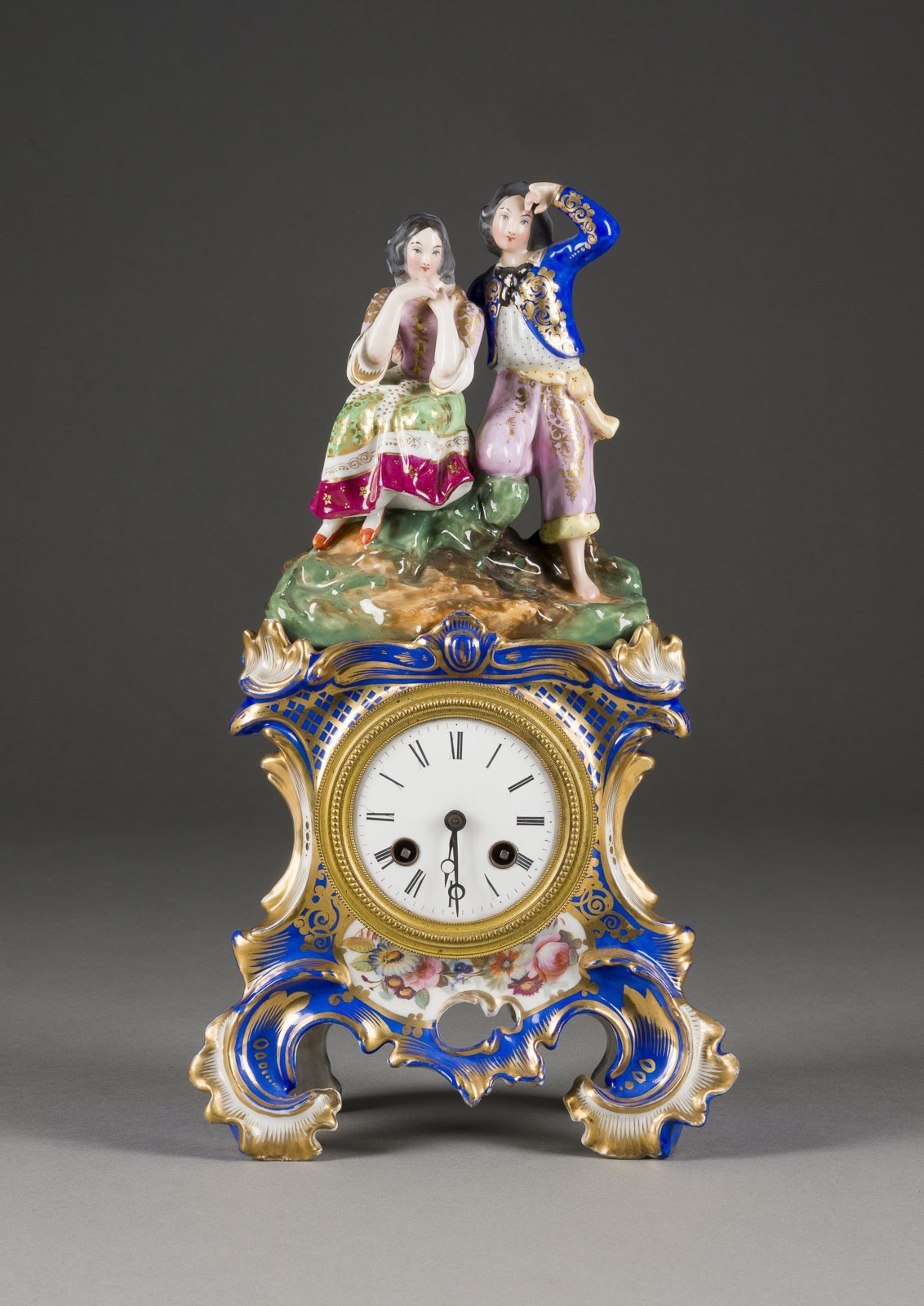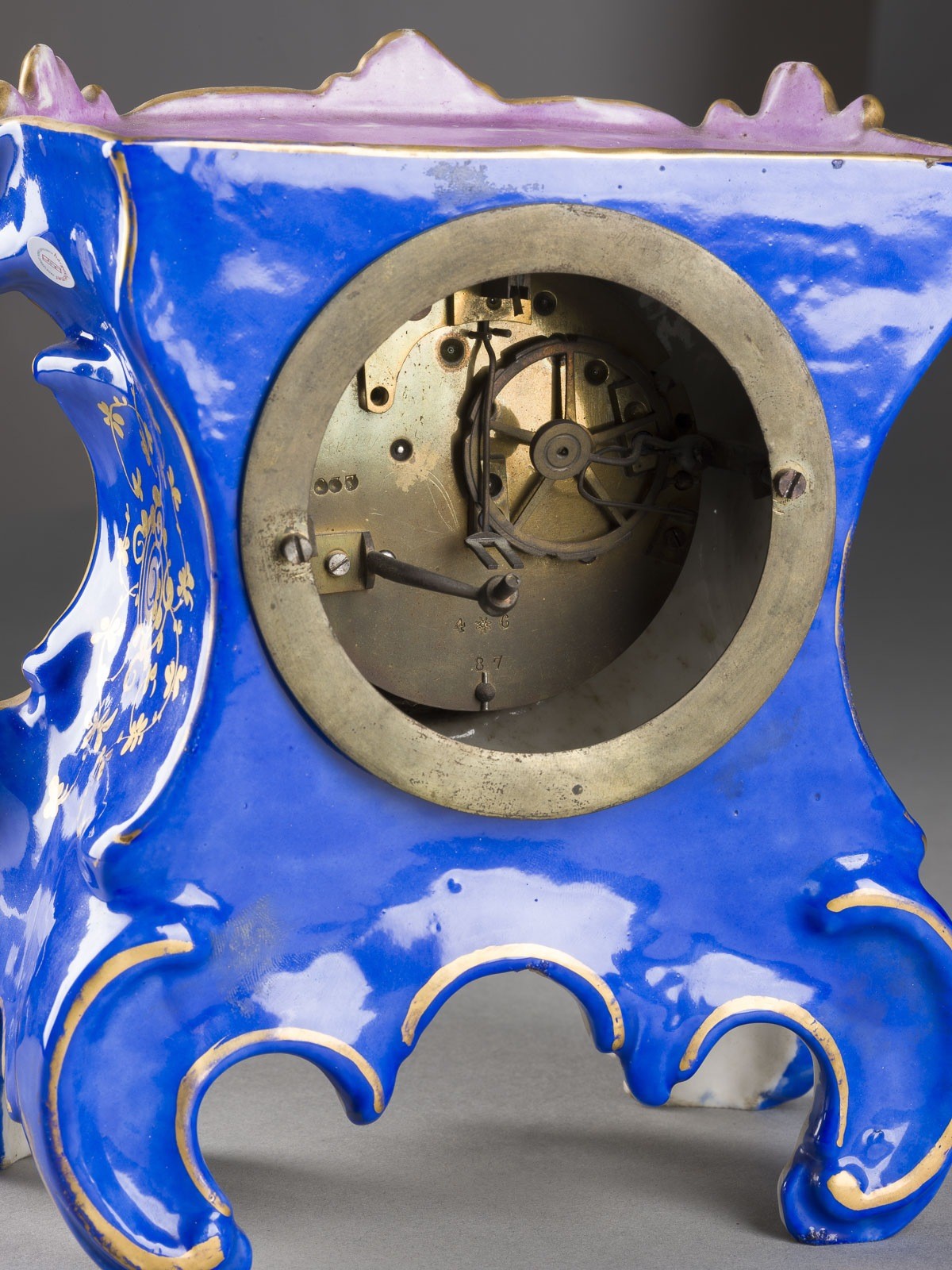 Porzellan, polychrome Malerei, teilweise Blaufond, Goldstaffage, Emailziffernblatt. H. 34,5 cm. Undeutliche Ritzmarke, Nummer '242', Uhrwerk mit undeutlicher Firmenmarke. Part. Farb- und Goldabrieb, Pendel und Schlüssel fehlen, hintere Abdeckung fehlt, Funktion ungeprüft.