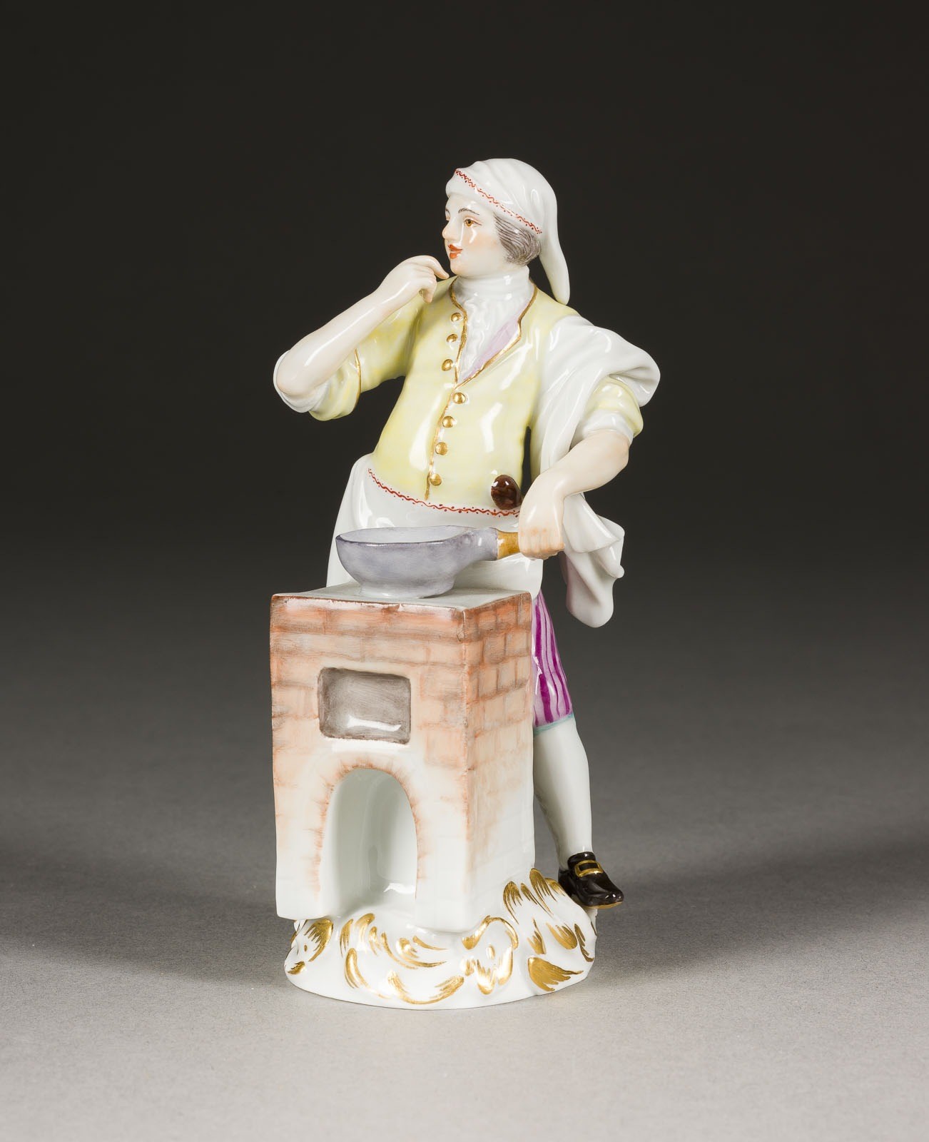 Porzellan, polychrome Malerei, dezente Goldstaffage. H. 13,6 cm. Unterglasurblaue Schwertermarke, Press- und Malernummer, Jahreszeichen, Modellnr. '60230'. Aus der Serie 'Cris de Paris'. 1. Wahl. Pfanne min. besch.