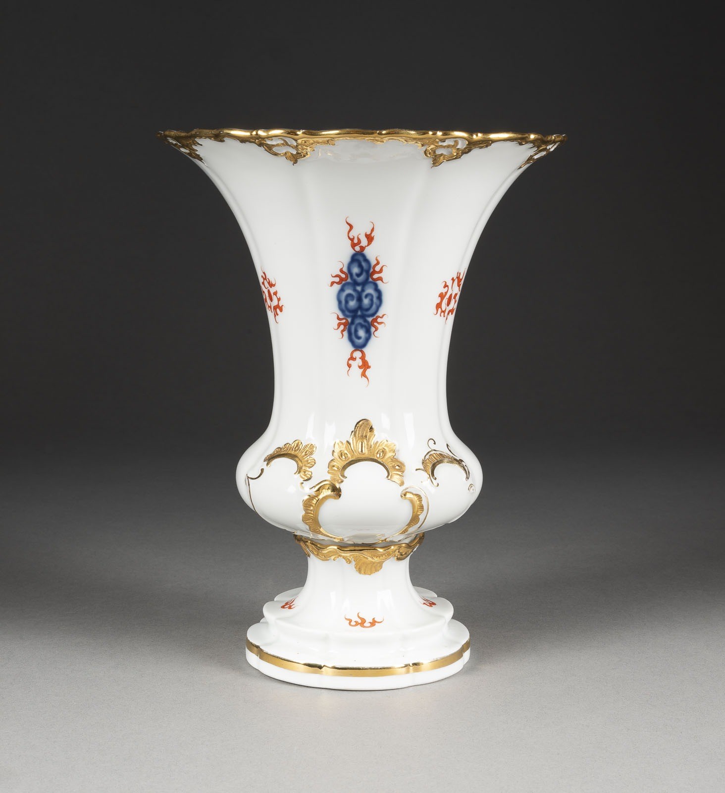 Porzellan, Camaieumalerei in Blaue, roter Aufglasurdekor, Goldstaffage. H. 23,8 cm. Unterglasurblaue Schwertermarke, Press- und Malernummer, Modellnr.