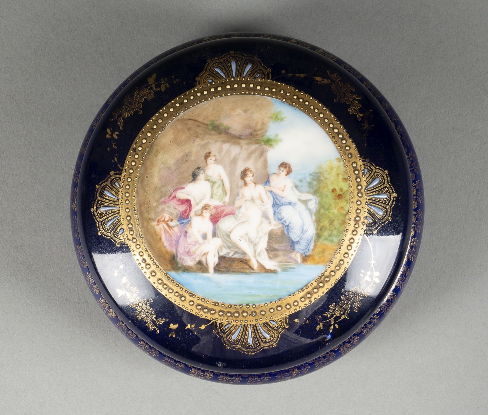 Porzellan, kobaltblauer Fond, polychrome Malerei, Goldstaffage. D. 11-15,5 cm. Einmal: Rote Stempelmarke mit Krone 'E W Turn Vienna', 'Made in Austria', einmal blaue Bindenschild, Modellnr. '5167 II/B. 127'. Part. Gold min. ber.
