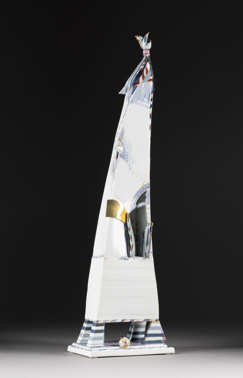 Porzellan, teilweise Biskuitporzellan, polychrome Malerei, Goldstaffage, Messingmontierung, vergoldet. H. 83 cm. Unterglasurblaue Schwertermarke, Unikat-Nummer '103/2002', Signatur der Künstlerin. 1. Wahl. Part. min. Brandrisse.