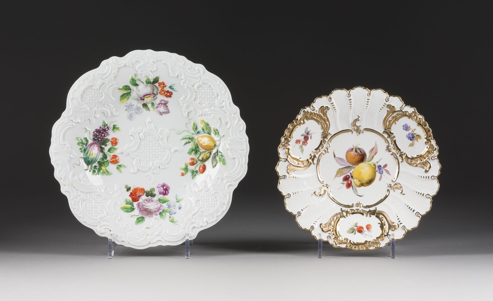 Porzellan, polychrome Malerei, Goldstaffage. D. 28 cm. Unterglasurblaue Schwertermarke u.a Knaufschwerter, Pressnummer, part. Modellnr. 'Y7a'. 1. Wahl. Min. best. und ber., Risse, part. Brandflecke.