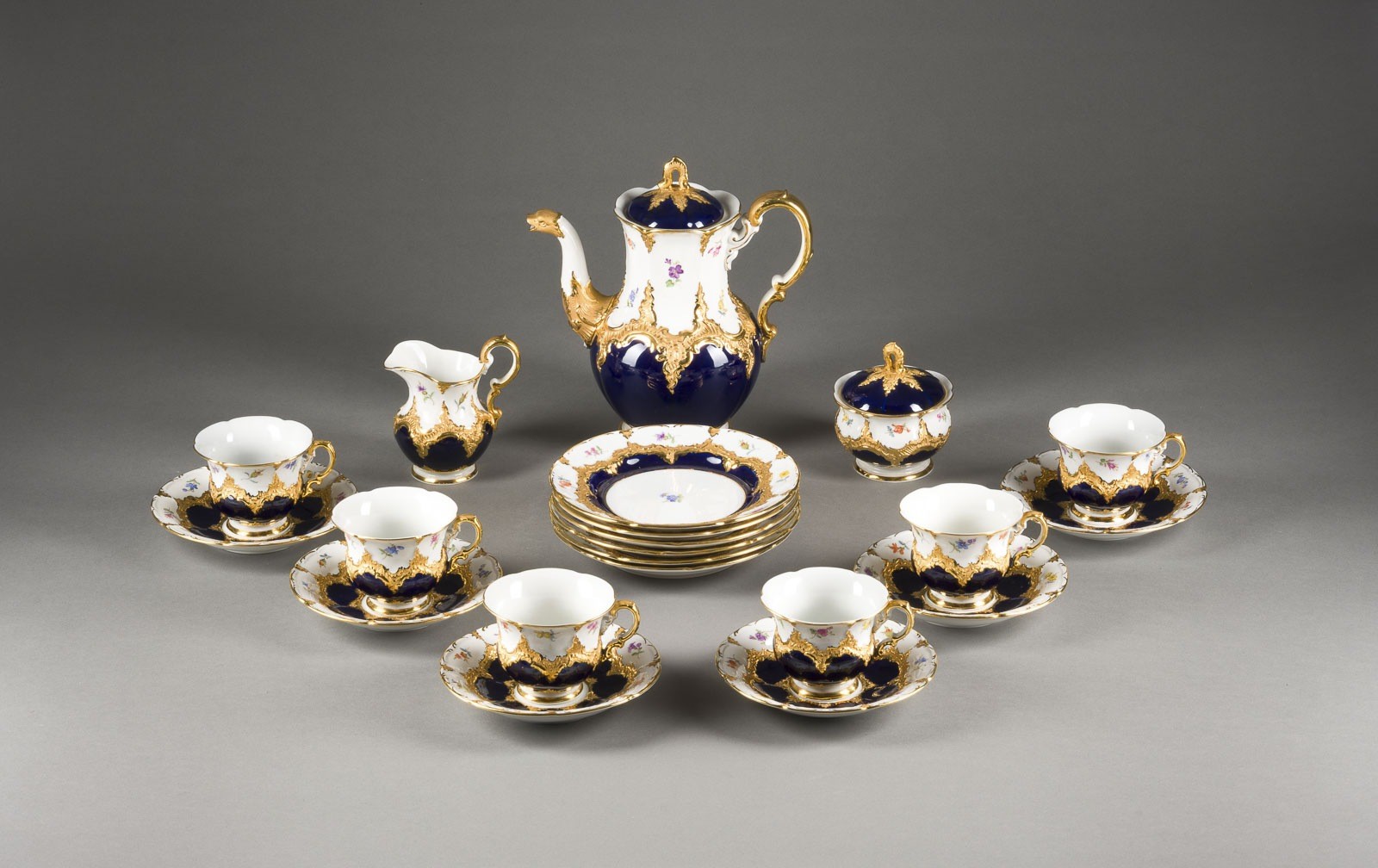 Porzellan, teilweise kobaltblauer Fond, polychrome Malerei, glänzende und matte Goldstaffage. H. 25,5 cm, D. 16,5-19,5 cm. Unterglasurblaue Schwertermarke, Press- und Vergoldernummer, Jahreszeichen, Modellnr. Form: B-Form. Bestehend aus: 1 Kaffeekanne, 1 Milchkännchen, 1 Zuckerdose, 6 Kaffeetassen