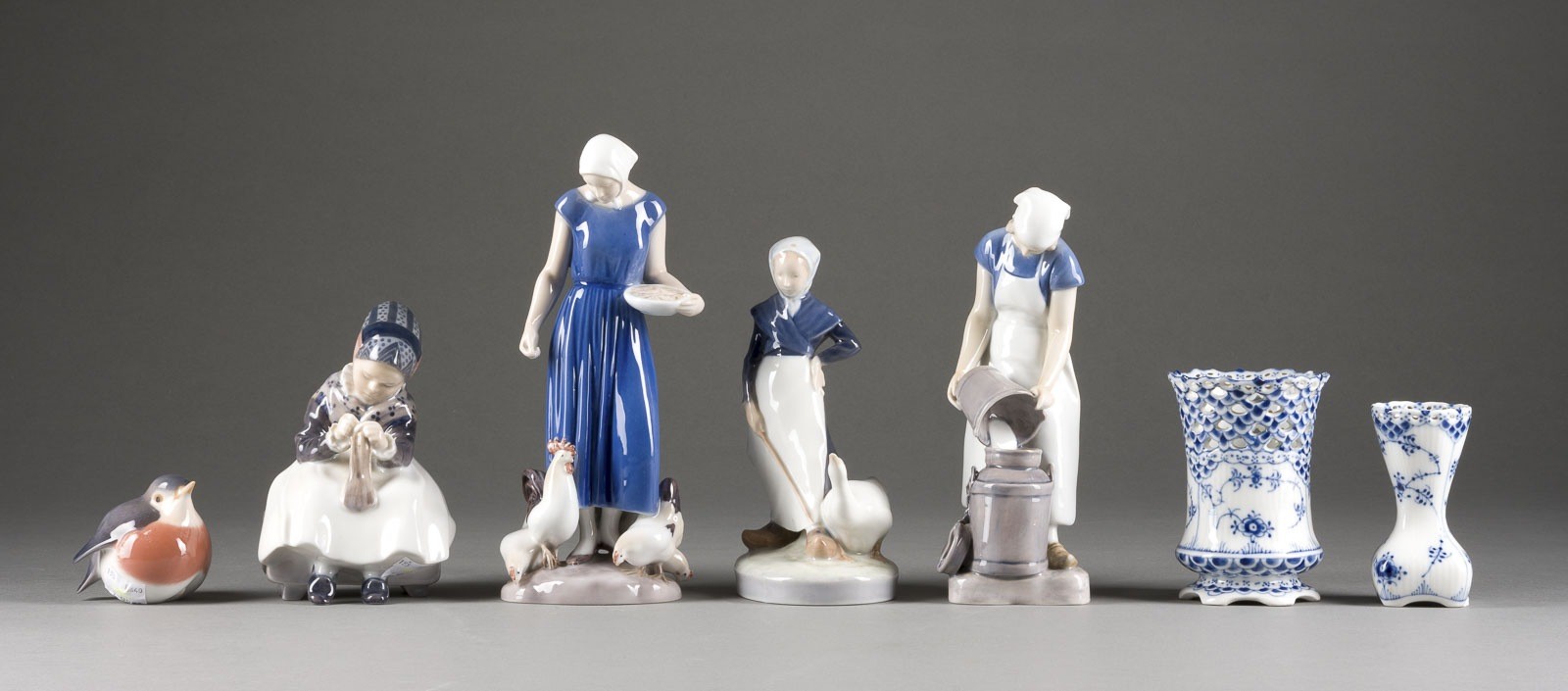 Porzellan, polychrom gefasst,. H. 6,8-23,5 cm. Unterglasurblaue Wellenmarke, grüner Manufakturstempel, Malerzeichen, Modellnr., teilw. monogrammiert und bez. Bestehend aus: 2 Vasen (Musselmalet Vollspitze), 1 Amager-Mädchen (näht in regionaler