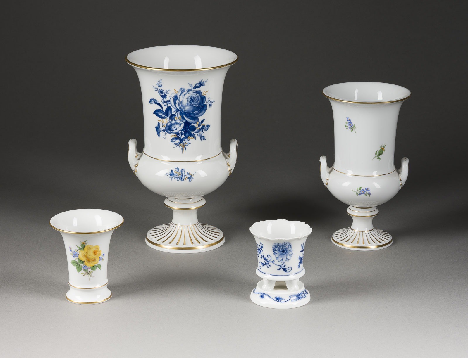 Porzellan, Blaumalerei, polychrome Malerei, Goldstaffage. H. 8,5-24,5 cm. Unterglasurblaue Schwertermarke, Press- und Malernummer, Jahreszeichen, Modellnr., einmal 'Aquatinta'. Bestehend aus: 1 Bechervase, 1 Veilchenvase, 2 Kratervasen. 1. Wahl.