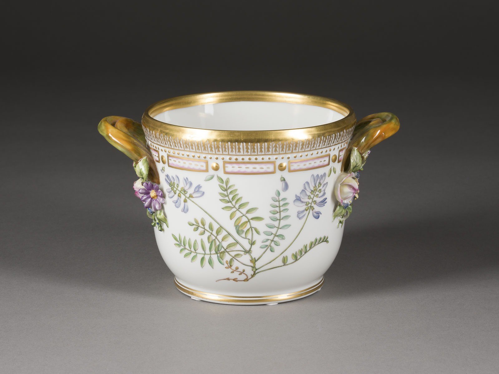 Porzellan, polychrome Malerei, Goldstaffage. H. 12,5 cm, D. 14 cm (ohne Griffe). Grüne Manufakturmarke, blaue Wellenmarke, Malerzeichen, Modellnr. '3570'. Verso bez. mit botanischen Namen in Schwarz. 1. Wahl.