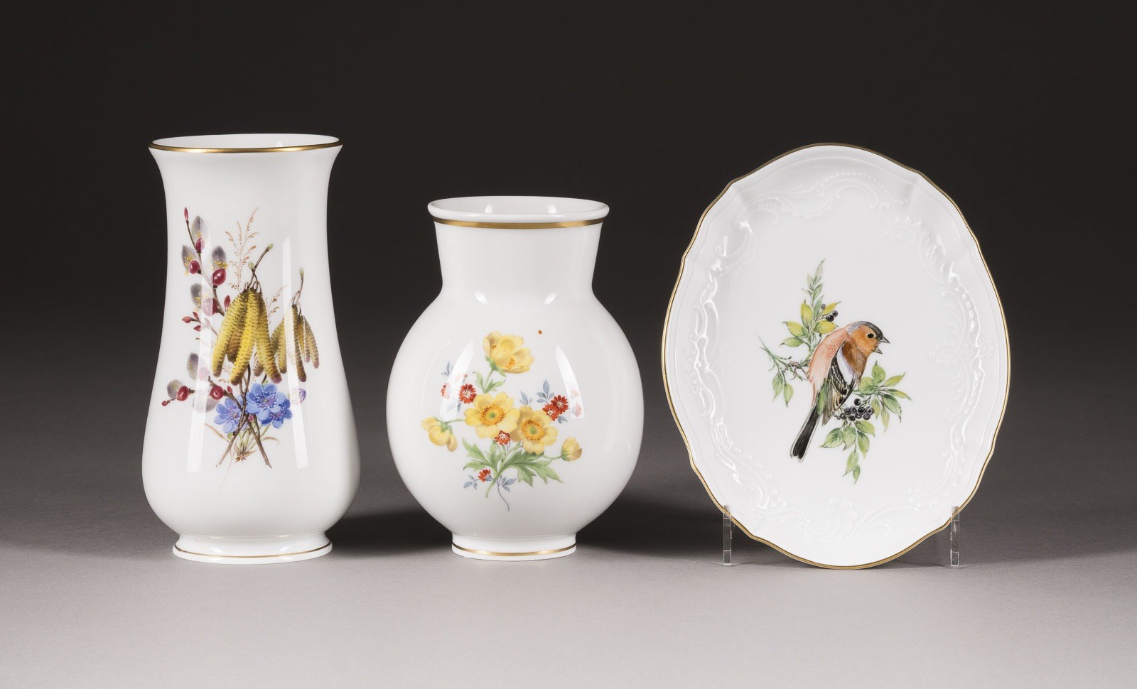 Porzellan, polychrome Malerei, Goldstaffage. H. 13-15 cm (Vasen), L. 15 cm (Schale). Unterglasurblaue Schwertermarke, Press- und Malernummer, Modellnr. 1. Wahl.