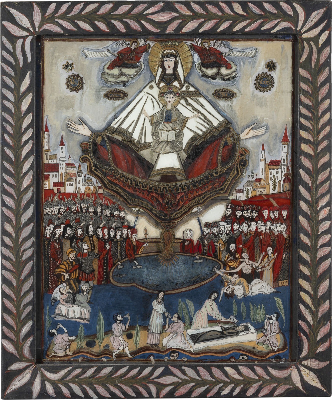THREE REVERSE PAINTINGS ON GLASS DEPICTING ADAM AND EVE AS WELL AS THE LUST JUDGEMENT Romanian, 2nd half of 20th century Painted on glass, the haloes and details part. made of gold. Two icons dated '1982' or '1983'. 33 x 30.8 cm/58.7 x 48.9 cm.