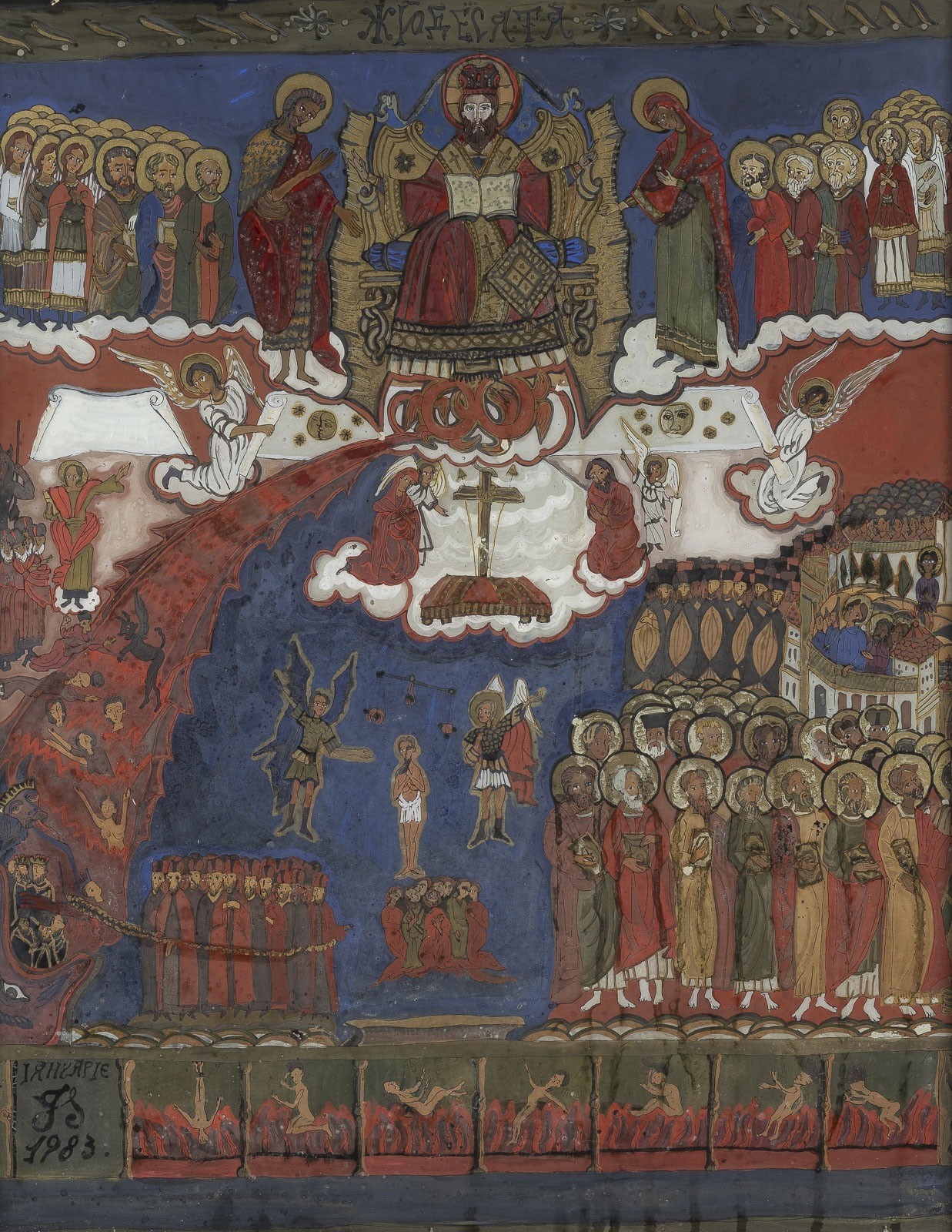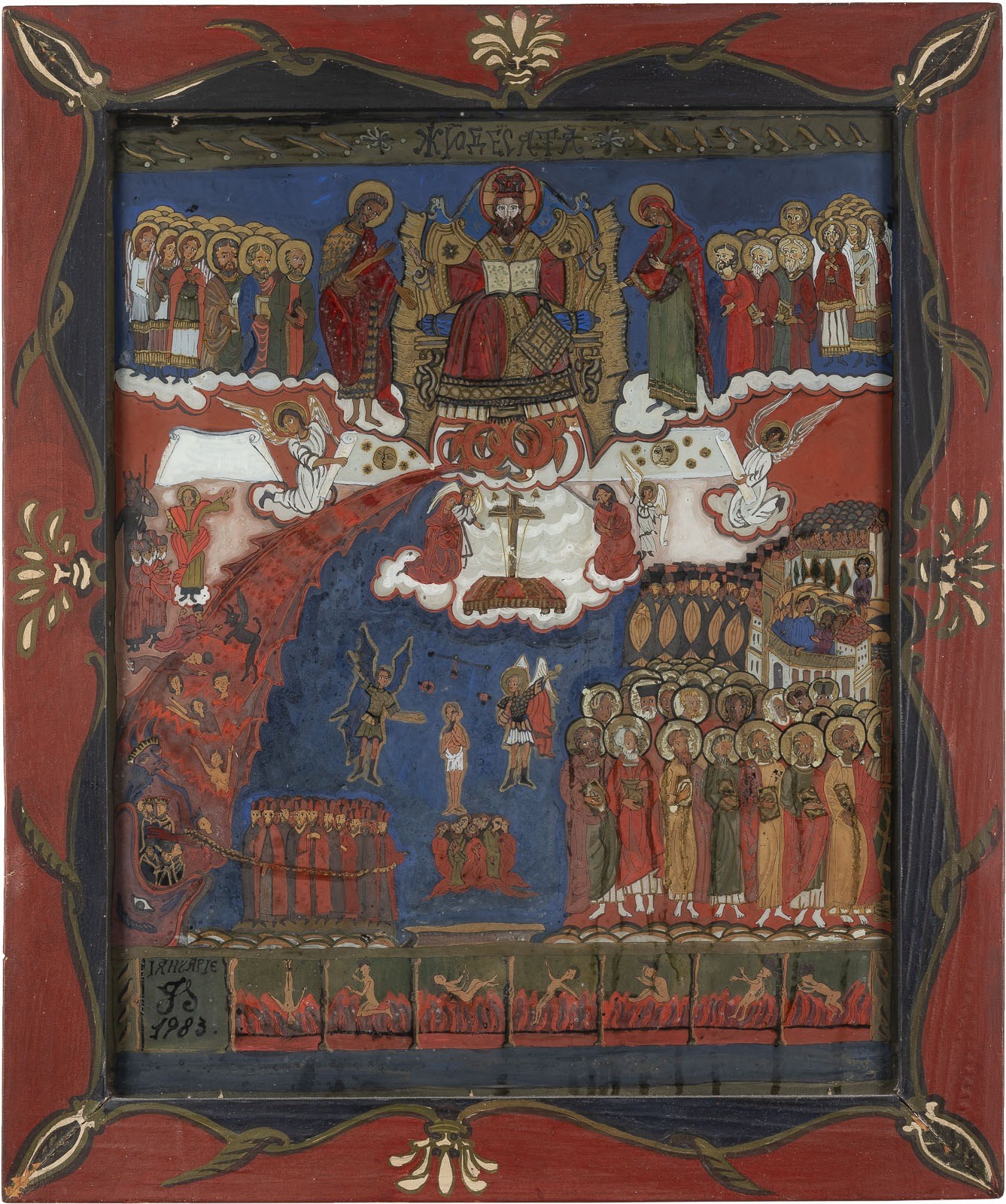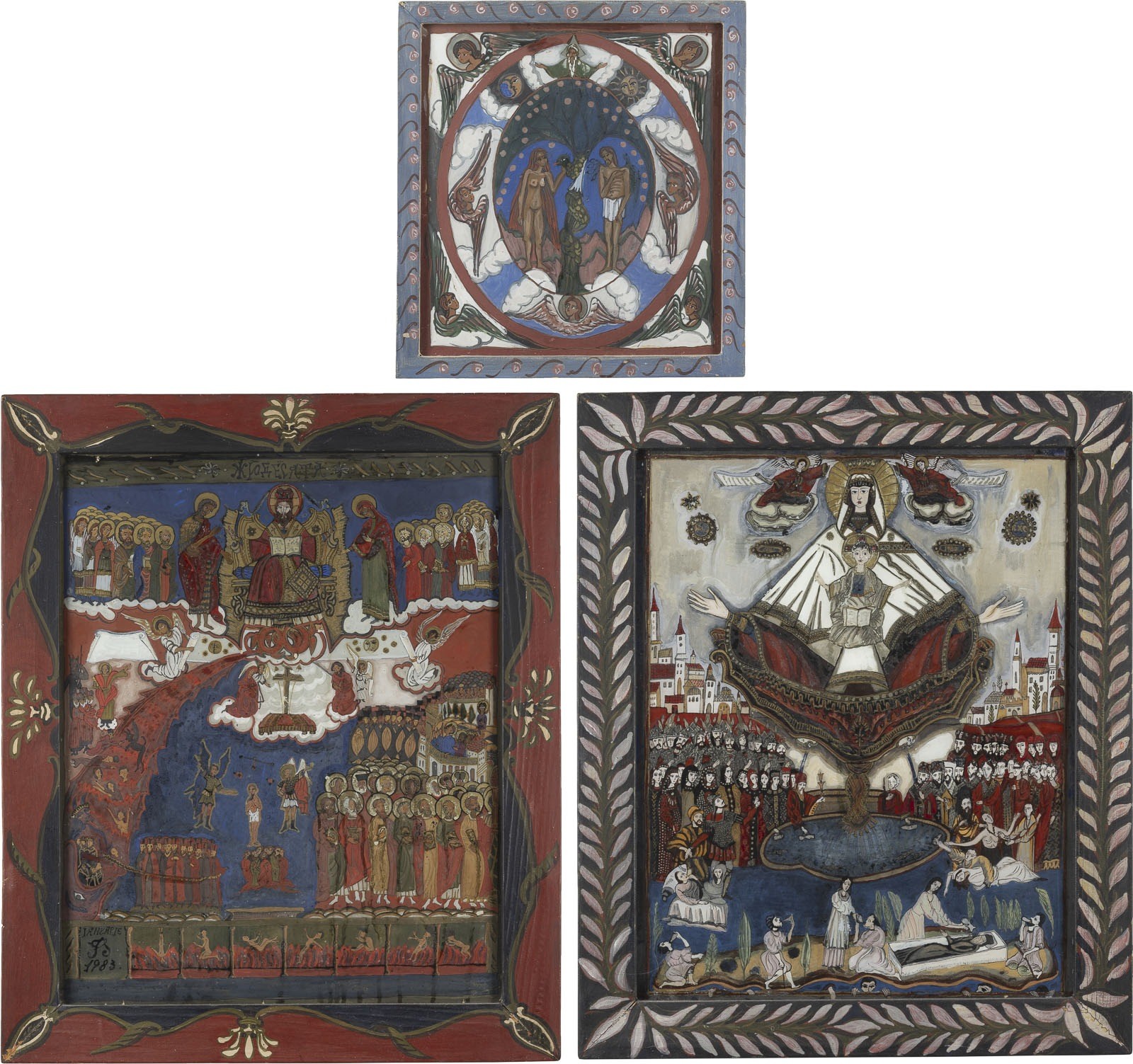 THREE REVERSE PAINTINGS ON GLASS DEPICTING ADAM AND EVE AS WELL AS THE LUST JUDGEMENT Romanian, 2nd half of 20th century Painted on glass, the haloes and details part. made of gold. Two icons dated '1982' or '1983'. 33 x 30.8 cm/58.7 x 48.9 cm.