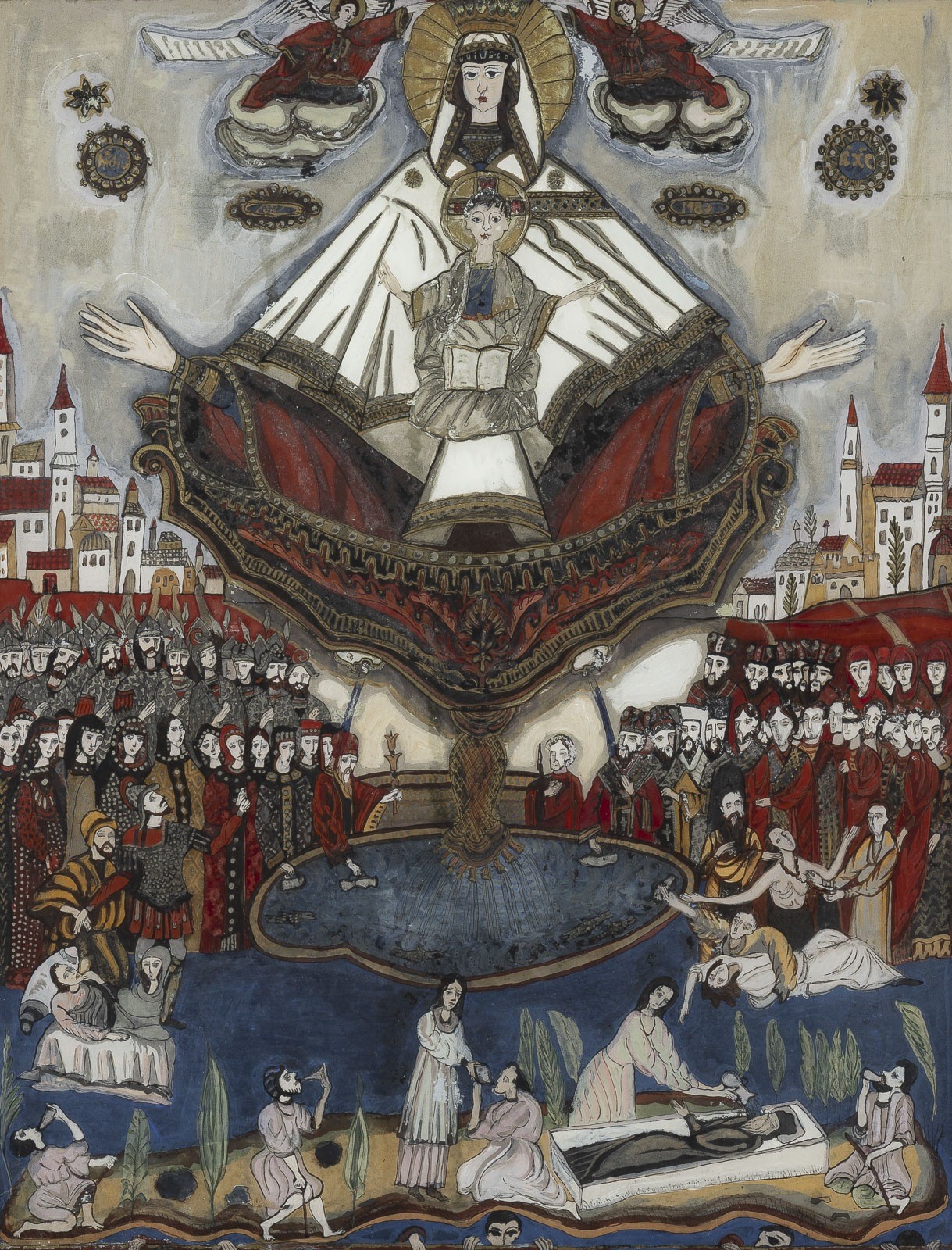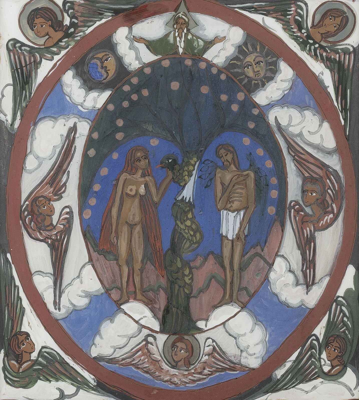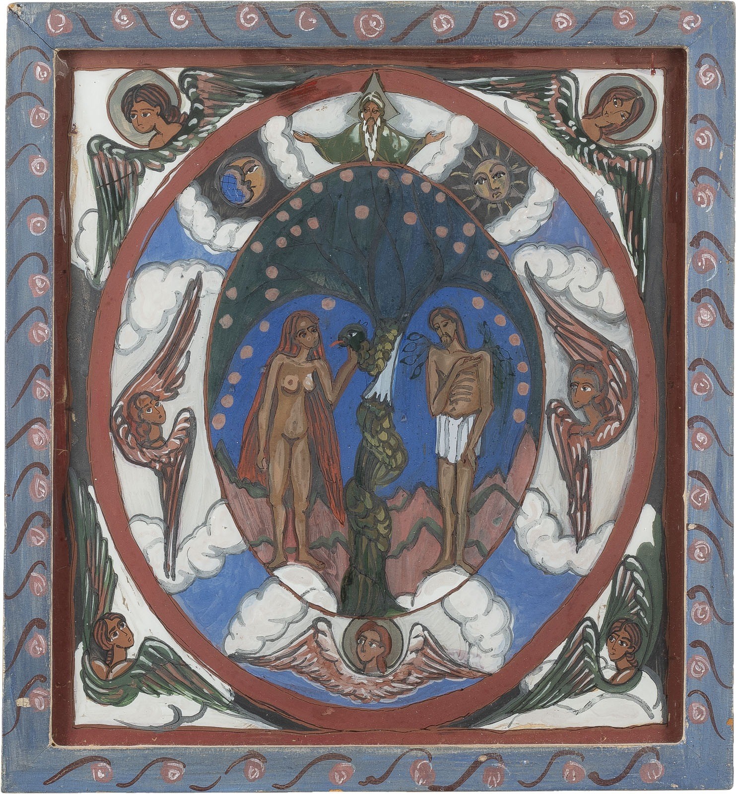 THREE REVERSE PAINTINGS ON GLASS DEPICTING ADAM AND EVE AS WELL AS THE LUST JUDGEMENT Romanian, 2nd half of 20th century Painted on glass, the haloes and details part. made of gold. Two icons dated '1982' or '1983'. 33 x 30.8 cm/58.7 x 48.9 cm.