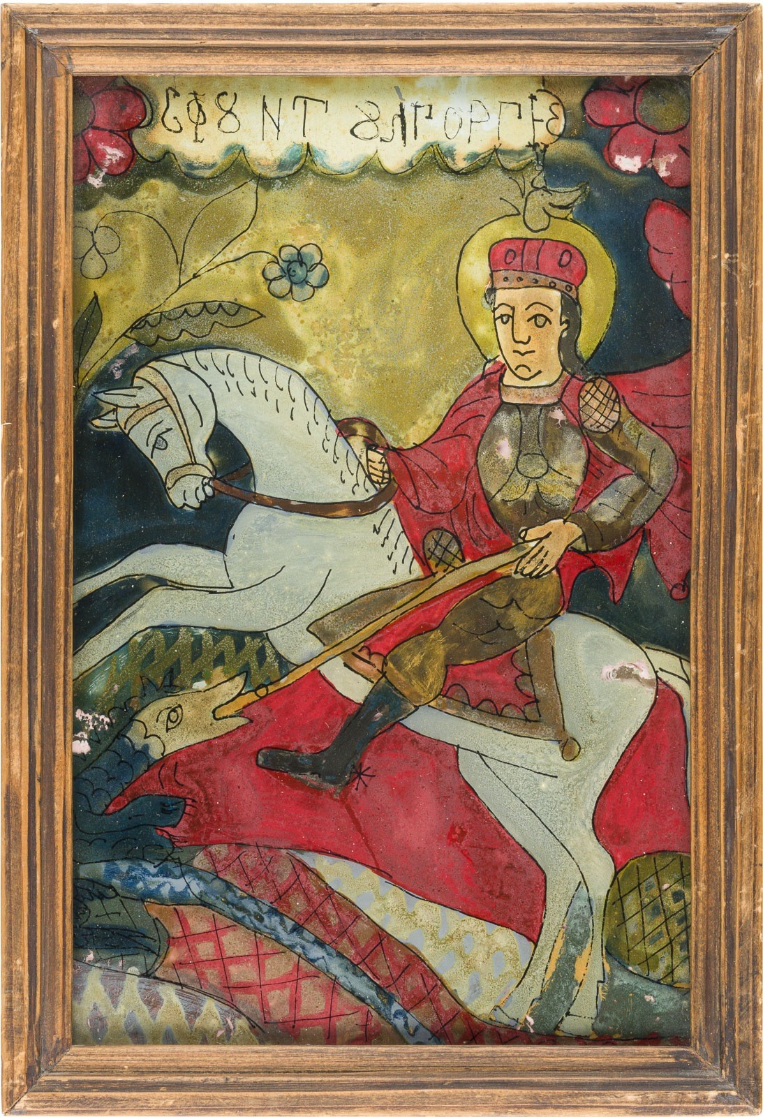 TWO REVERSE PAINTINGS ON GLASS: 'ANIVERSARE' AND ST. GEORGE KILLING THE DRAGON Romanian, 20th century Painted on glass, the details part. made of gold. One icon signed and dated lower left 'Dorin 85'. Losses. 34.7/35.5 cm high.