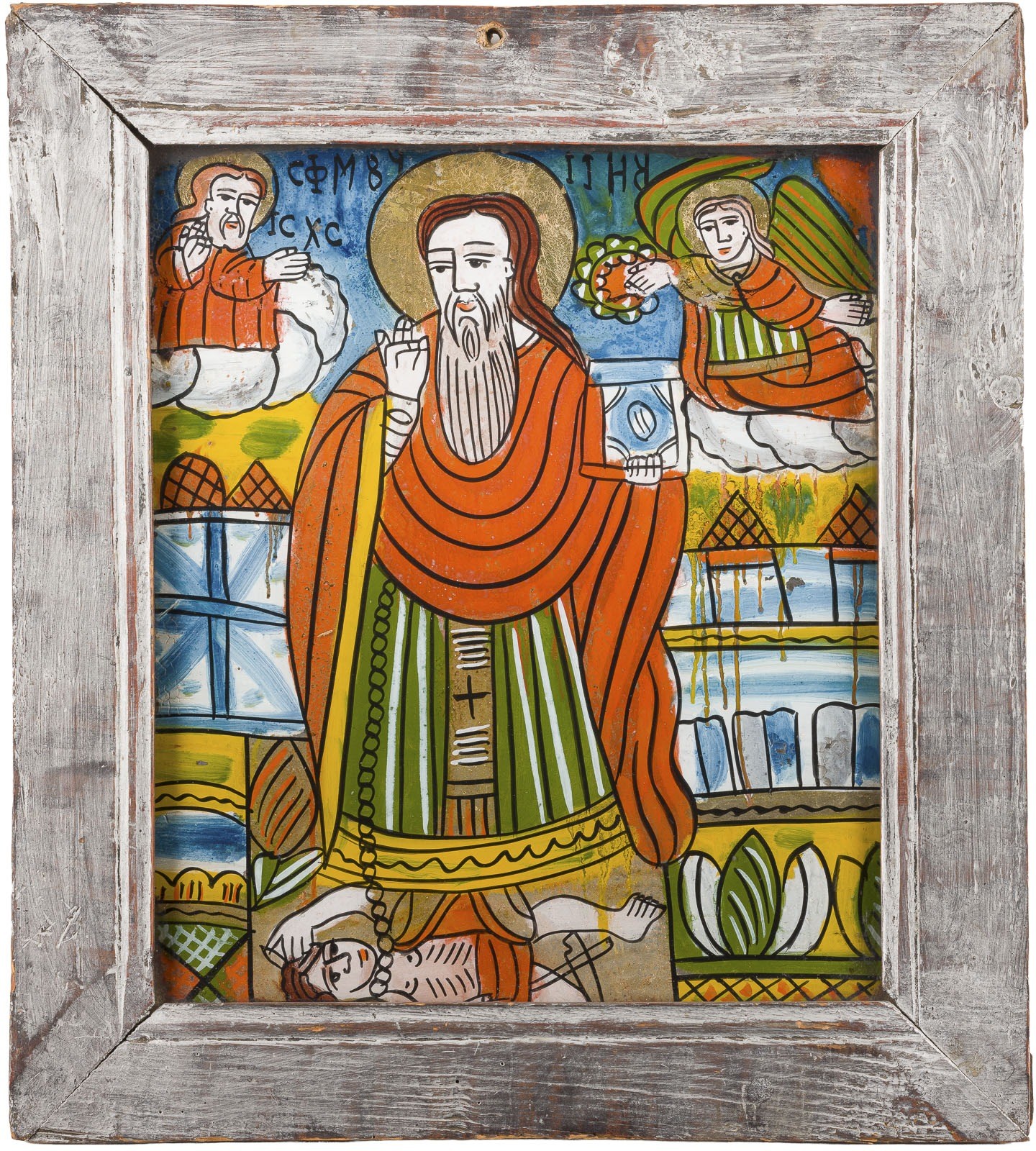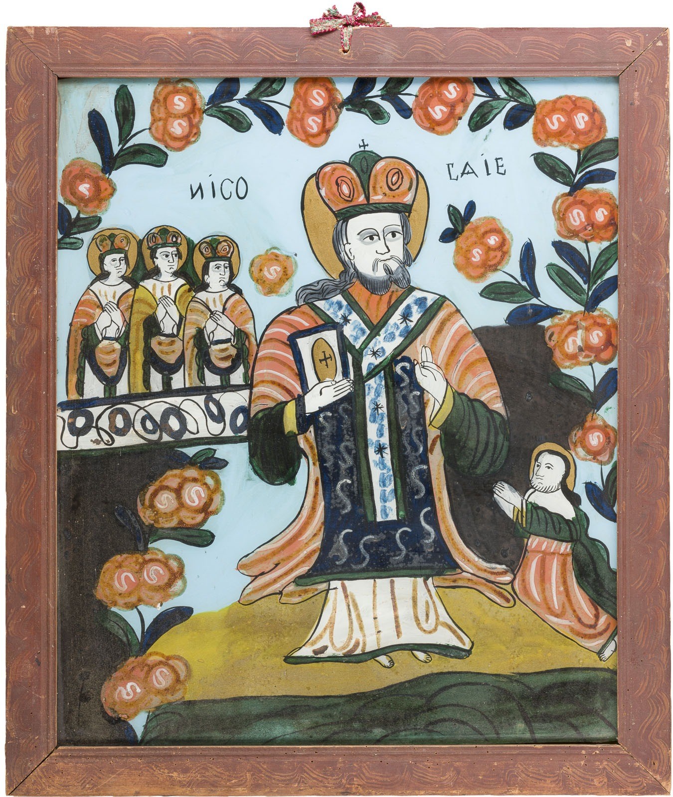 TWO REVERSE PAINTINGS ON GLASS DEPICTING ST. HARALAMPOS AND ST. NICHOLAS Romanian, 19th century Painted on glass, the haloes and details partially made of gold. Losses. 44 x 38.5 cm/69.3 x 59 cm.