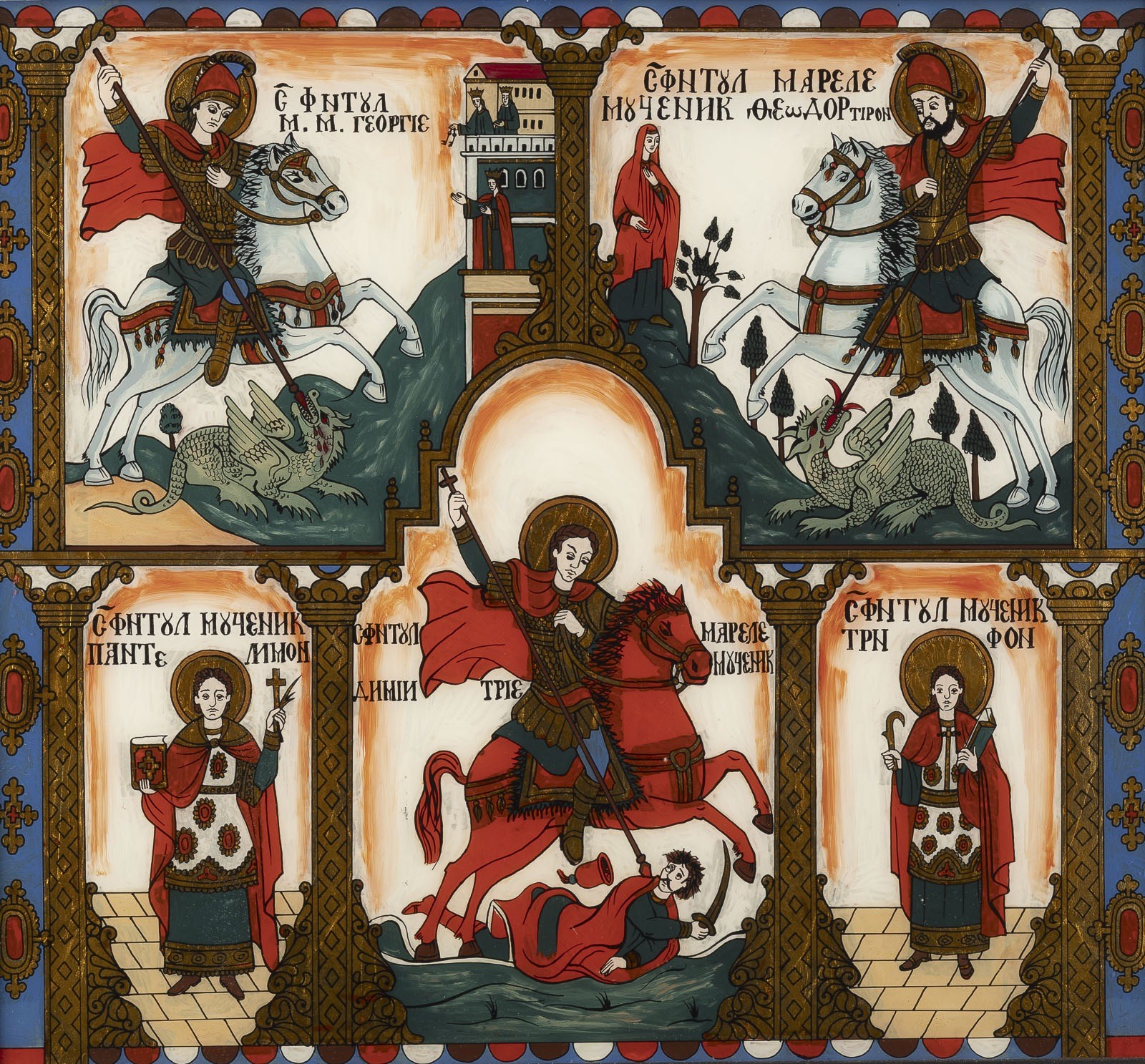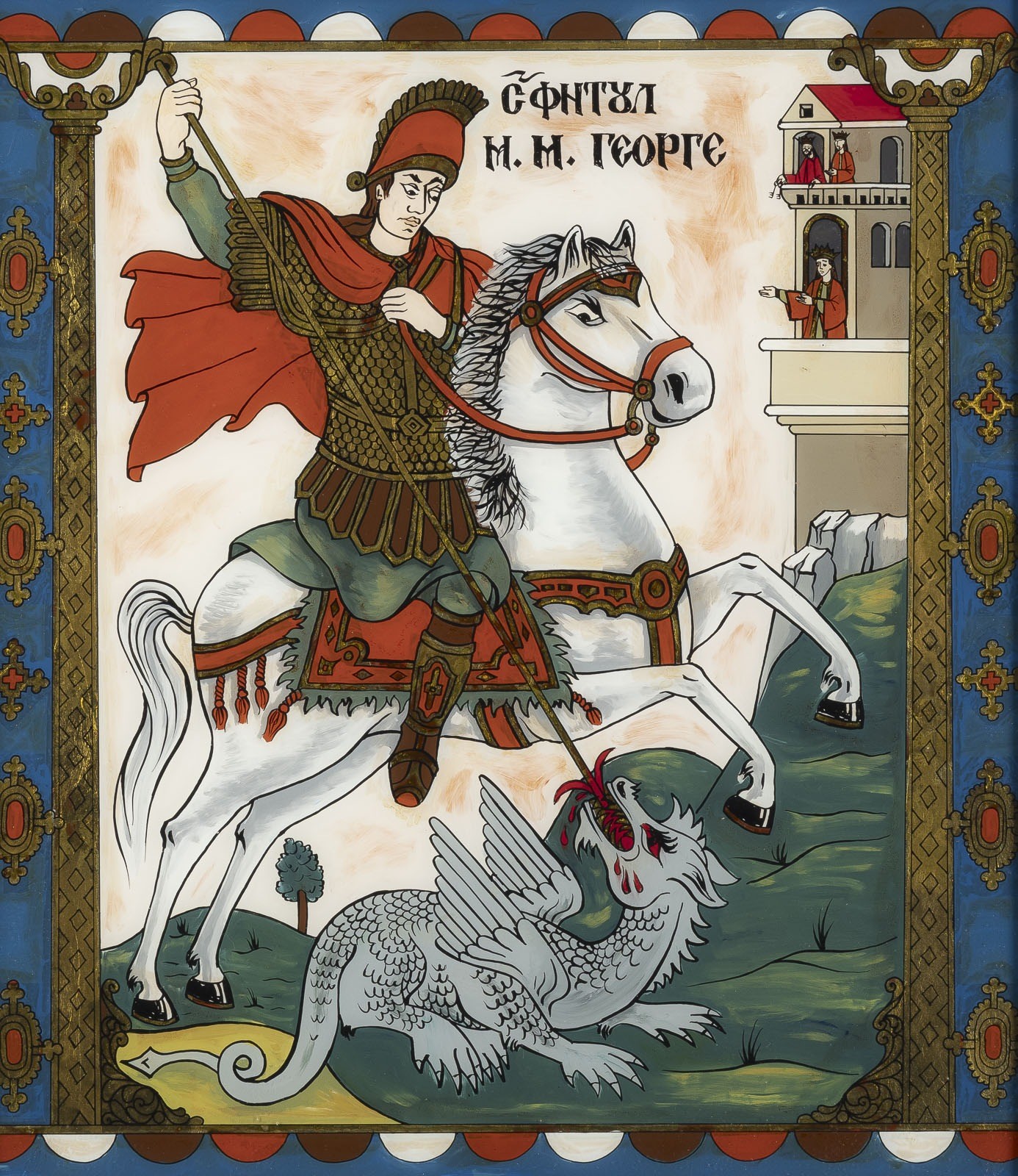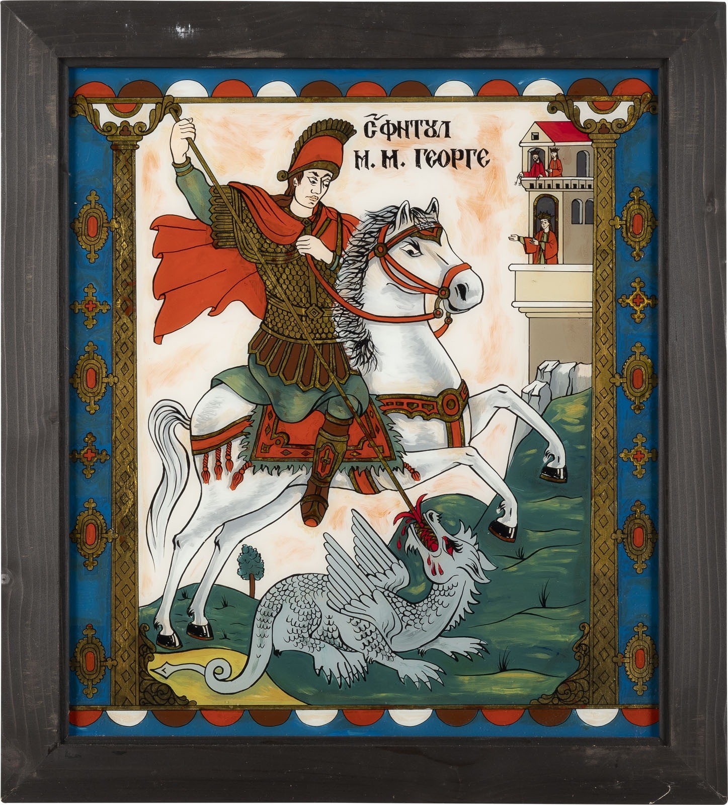 TWO REVERSE PAINTINGS ON GLASS SHOWING ST. GEORGE KILLING THE DRAGON AND SELECTED SAINTS Romanian, 20th century Painted on glass, the haloes and details made of gold. 53.5 x 48.2 cm / 53.7 x 58.5 cm.
