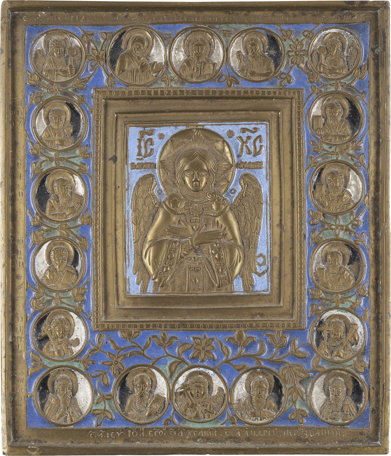 A BRASS AND ENAMEL ICON SHOWING CHRIST, THE BLESSED SILENCE Russian, 19th century Cast in relief, four-colour enamelled. Enamel very slightly chipped. 15.3 cm high.