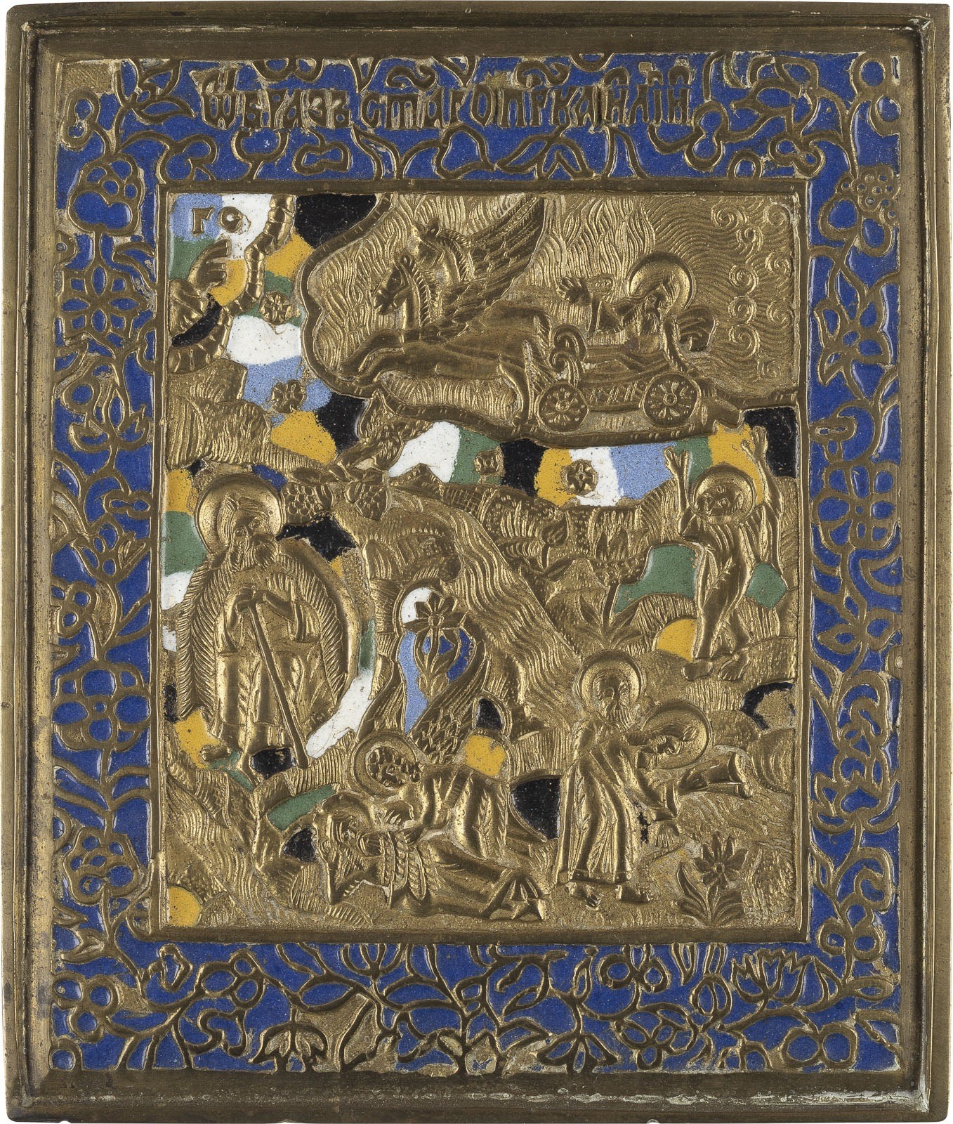 A BRASS AND ENAMEL ICON SHOWING THE PROPHET ELIJAH AND HIS FIERY ASCENT TO HEAVEN Russian, 19th century Cast in relief, six-colour enamelled. Enamel min. chipped. 15 cm high.
