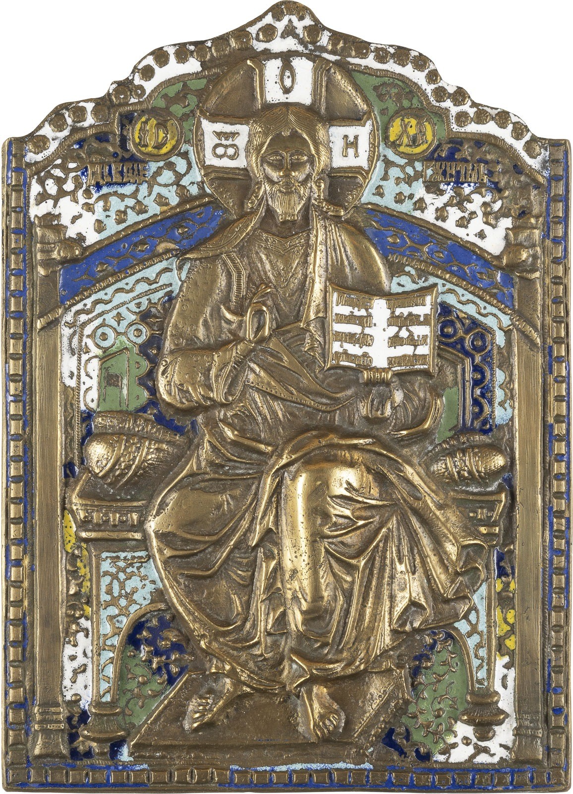 A BRASS ADN ENAMEL ICON SHOWING THE ENTHRONED CHRIST PANTOKRATOR Russian, 19th century Cast in relief, five-colour enamelled. Enamel min. chipped. 21.9 cm high.