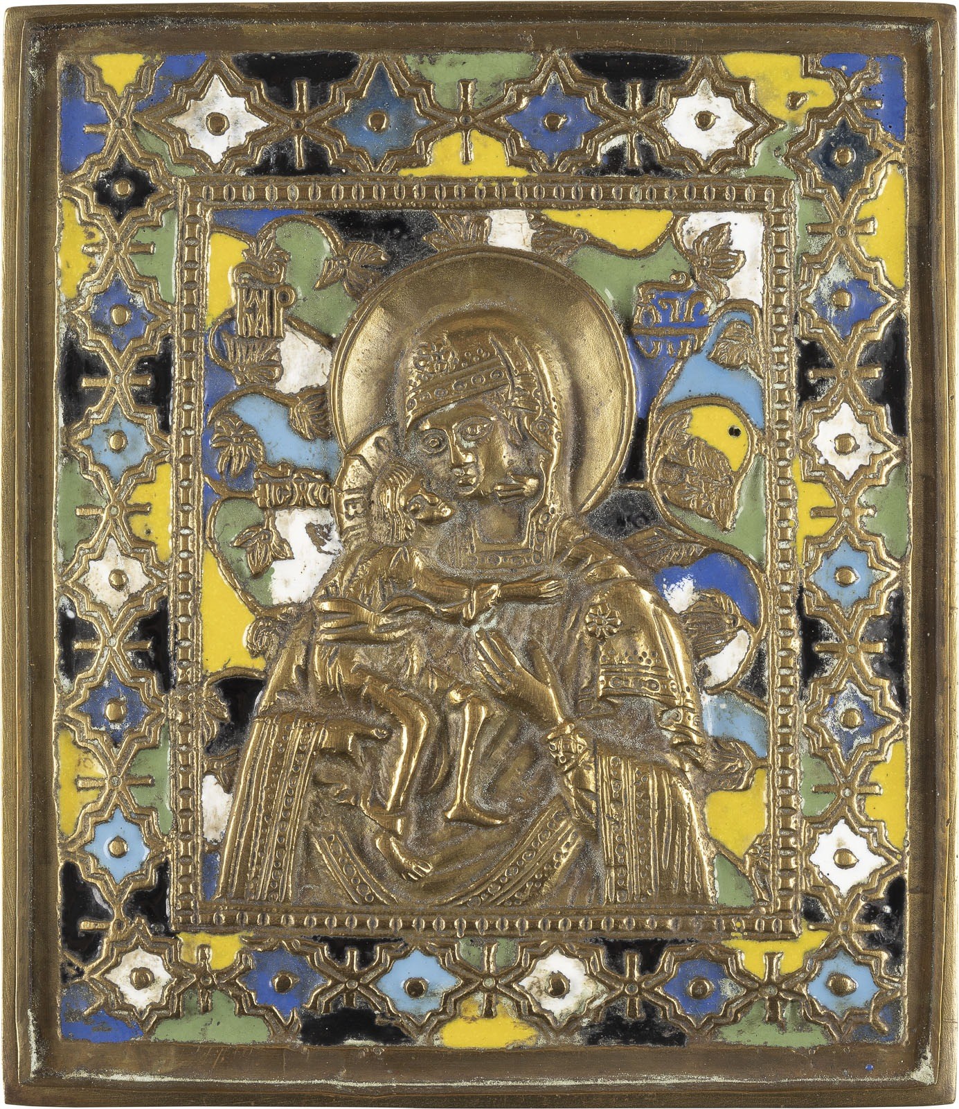 A BRASS AND ENAMEL ICON SHOWING THE FEODOROVSKAYA MOTHER OF GOD Russian, around 1900 Cast in relief, six-colour enamelled. Enamel very slightly chipped. 12.6 cm high.