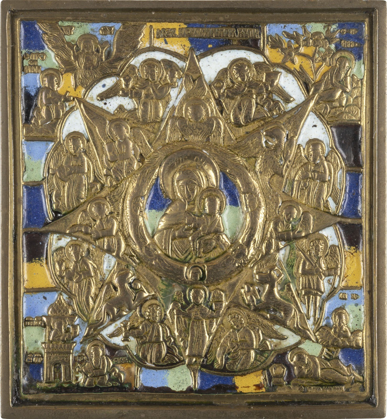 A BRASS AND ENAMEL ICON SHOWING THE MOTHER OF GOD 'OF THE BURNING BUSH' Russian, 19th century Cast in relief, six-colour enamelled. Enamel very slightly chipped. 10.1 cm high.
