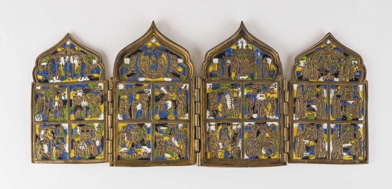 A BRASS AND ENAMEL TETRAPTYCH SHOWING LITURGICAL FEASTS OF THE ORTHODOX CHURCH YEAR Russian, 19th century Cast in relief, five-colour enamelled. Enamel min. chipped. 17.5 cm high.
