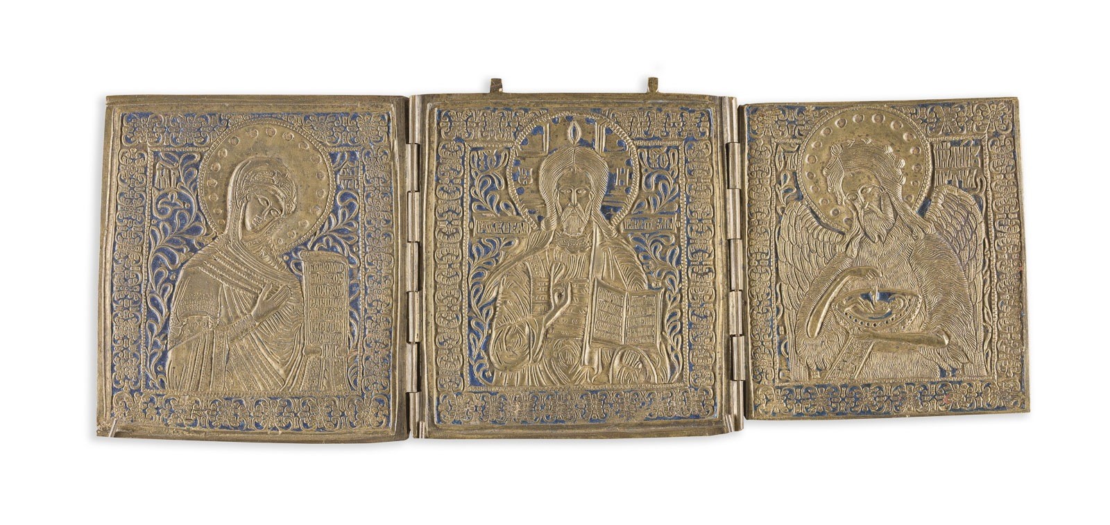 A BRASS AND ENAMEL TRIPTYCHON SHOWING DEISIS Russian, 19th century Cast in relief, enamelled in blue. Enamel chipped. 14.2 cm high.