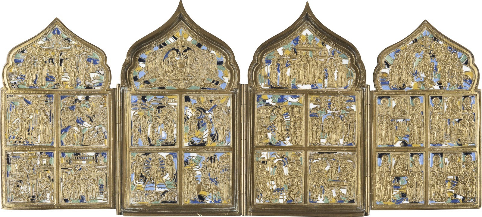 A FINE BRASS AND ENAMEL TETRAPTYCH SHOWING LITURGICAL FEASTS OF THE ORTHODOX CHURCH YEAR Russian, 19th century Cast in relief, six-colour enamelled. Enamel very slightly chipped. 18.2 cm high.
