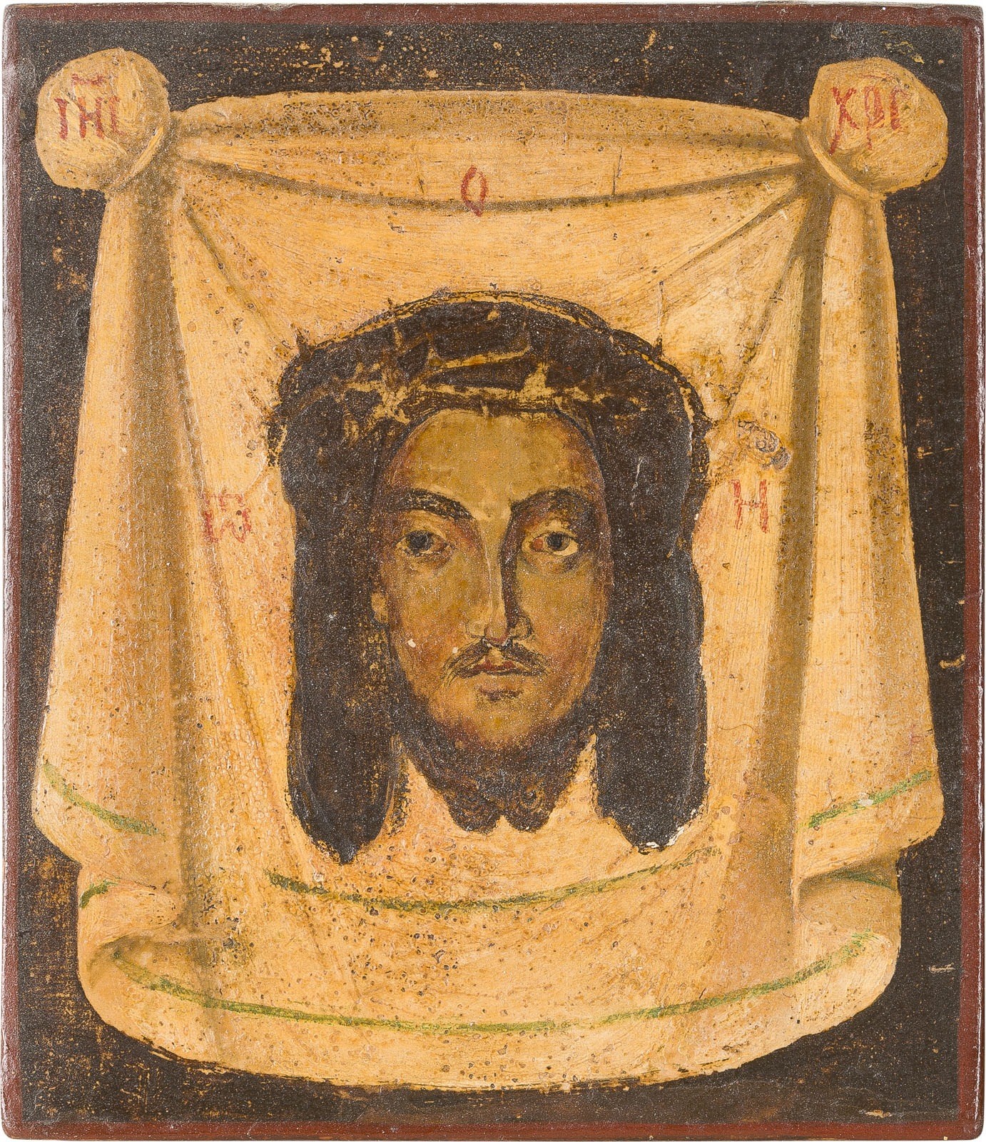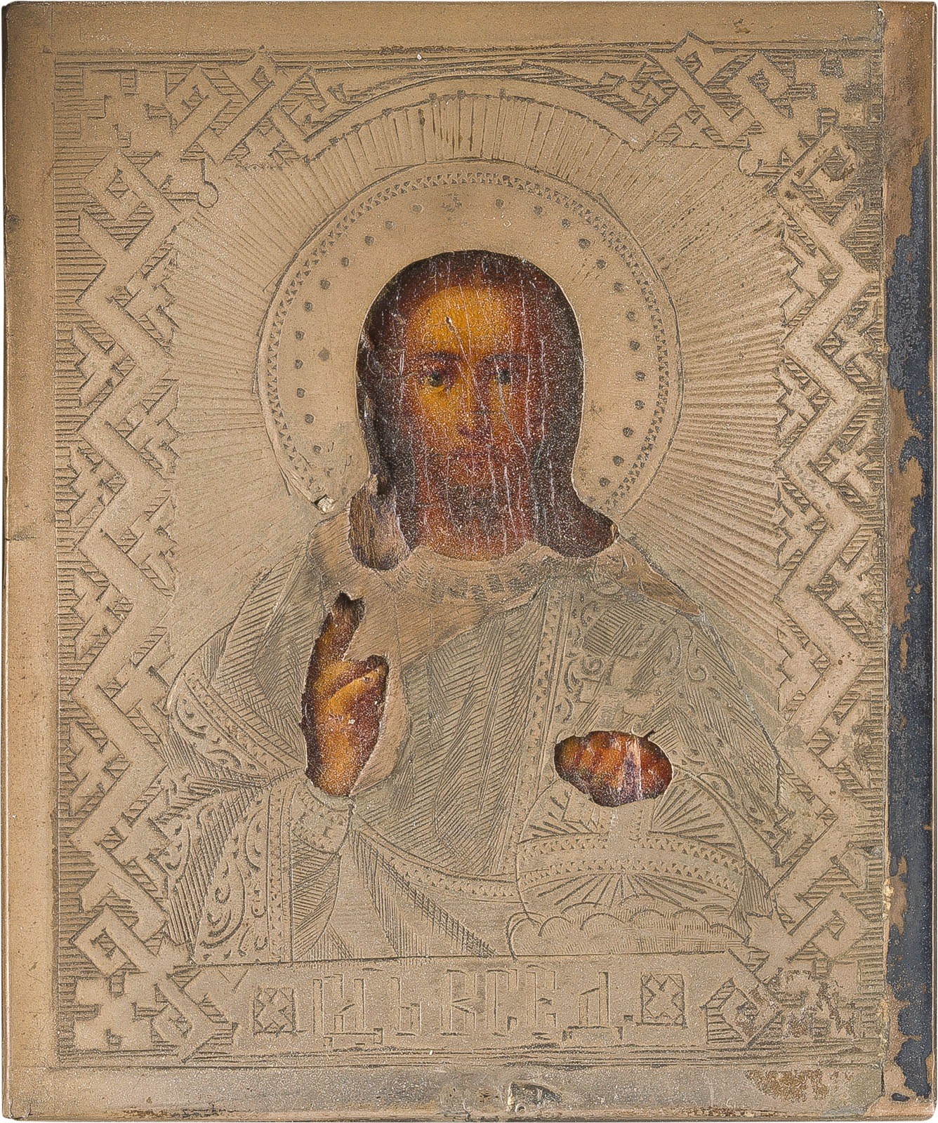 AN ENAMEL ICON SHOWING THE THREE HIERACHS AND TWO MINIATURE ICONS OF CHRIST PANTOKRATOR WITH SILVER OKLAD AND MANDYLION Russian, 19th century (icons), Russian, Moscow, 1885 (silver oklad) Tempera / oil on wood panels / enamel on copper, metal-mounted. The silver oklad engraved with geometric patterns. Marked with city hallmark, assayer's mark, and master's mark. Minimally restored. 6-8.8 cm high.