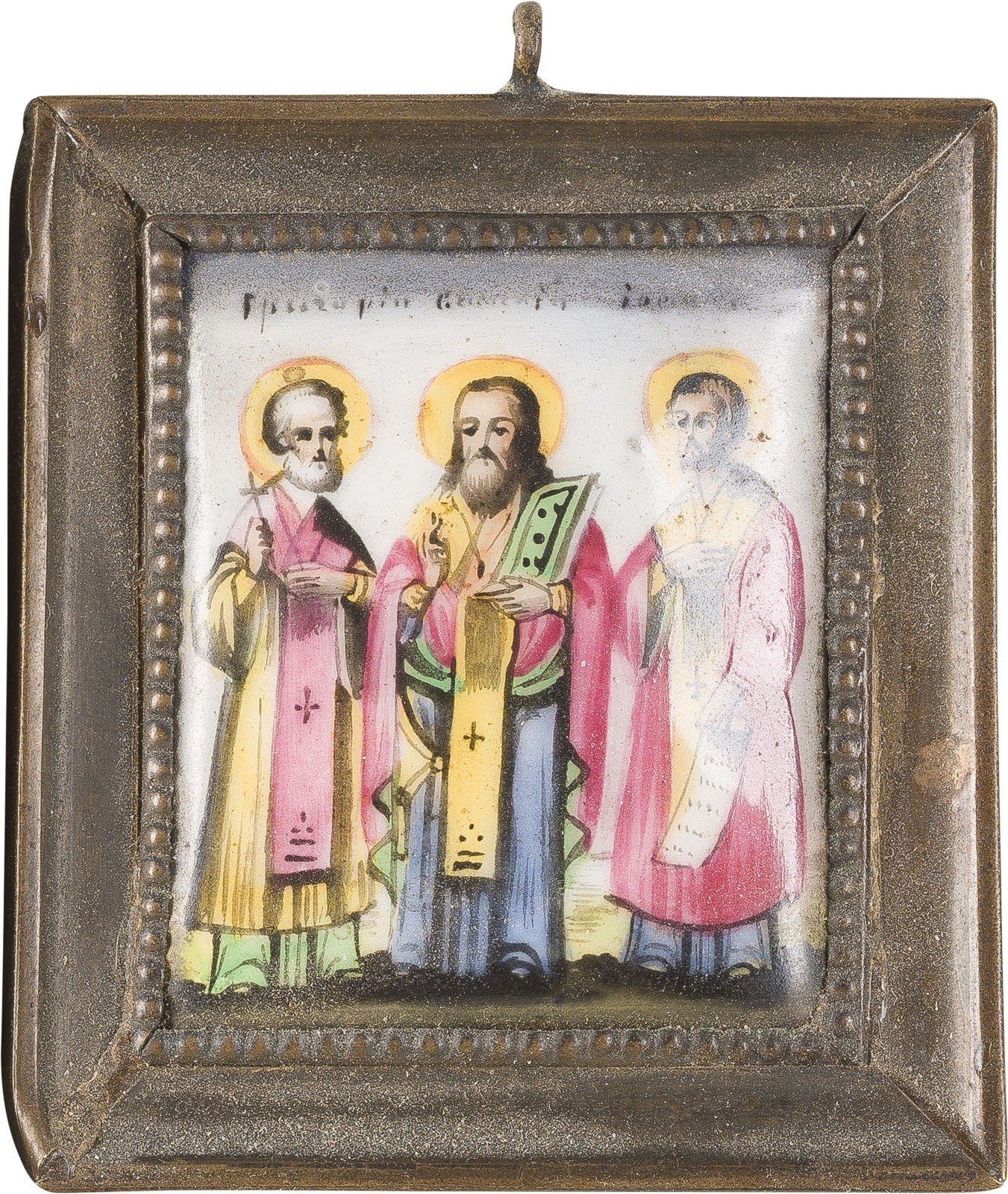 FINIFT MIT DEN DREI KIRCHENVÄTERN UND ZWEI MINIATUR-IKONEN MIT CHRISTUS PANTOKRATOR UND MANDYLION