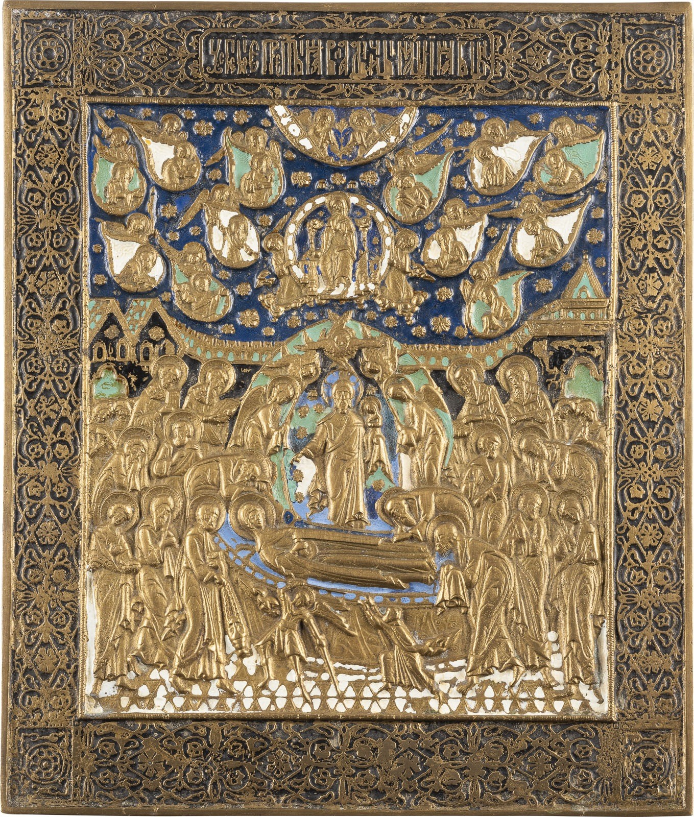 A LARGE BRASS ICON SHOWING THE DORMITION OF THE MOTHER OF GOD Russian, 19th century Cast in relief, later coloured. 28.2 cm high.
