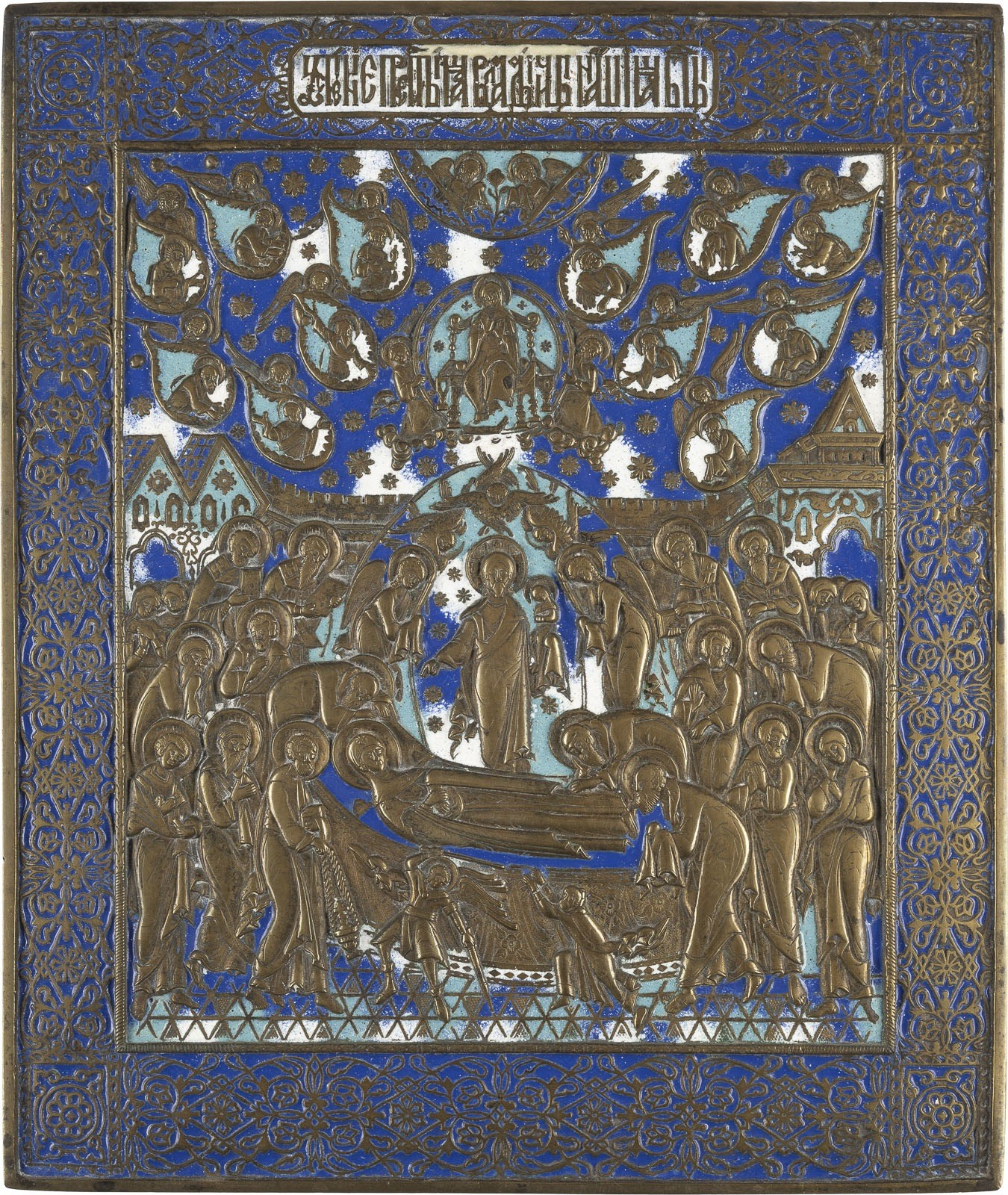 A LARGE BRASS AND ENAMEL ICON SHOWING THE DORMITION OF THE MOTHER OF GOD Russian, 19th century Cast in relief, three-colour enamelled. 29,3 cm high.