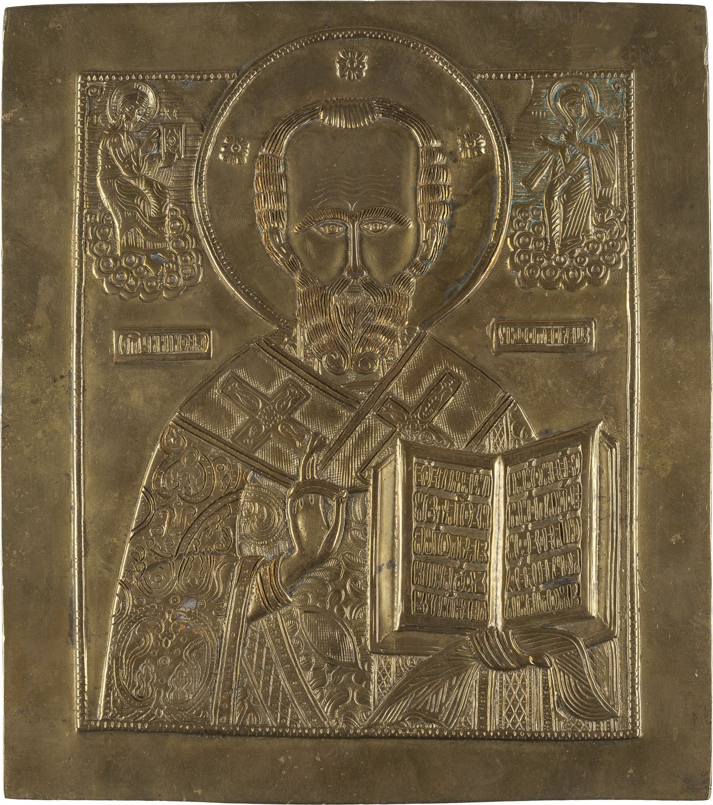 A LARGE BRASS ICON SHOWING ST. NICHOLAS OF MYRA Russian, around 1800 Cast in relief. 25.3 cm high.