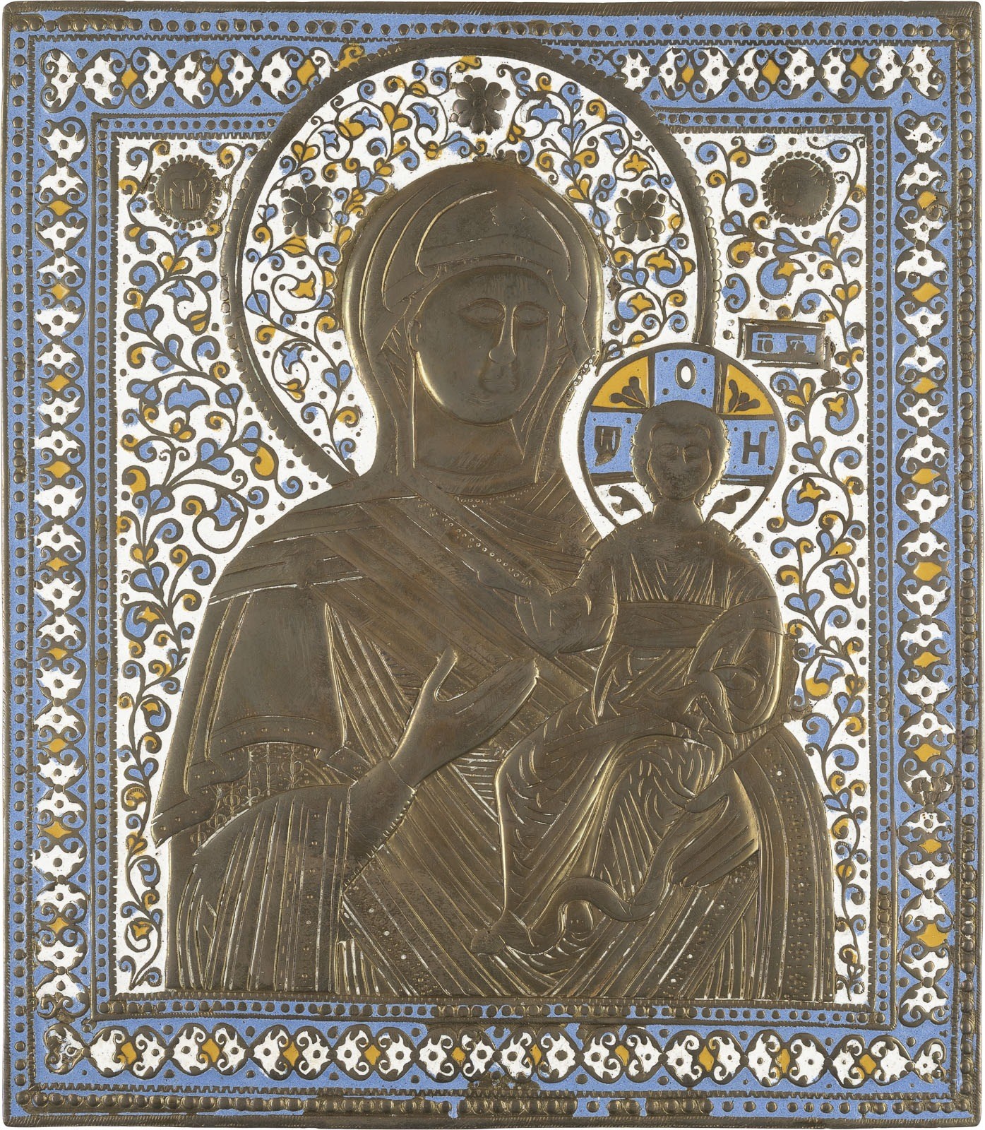 A LARGE BRASS AND ENAMEL ICON SHOWING THE SMOLENSKAYA MOTHER OF GOD Russian, around 1800 Cast in relief, three-colour enamelled. Enamel min. chipped. 30.2 cm high.