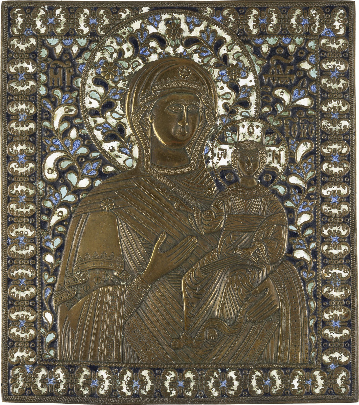 A LARGE BRASS AND ENAMEL ICON SHOWING THE SMOLENSKAYA MOTHER OF GOD Russian, 19th century Cast in relief, four-colour enamelled. Enamel min. chipped. 26.6 cm high.