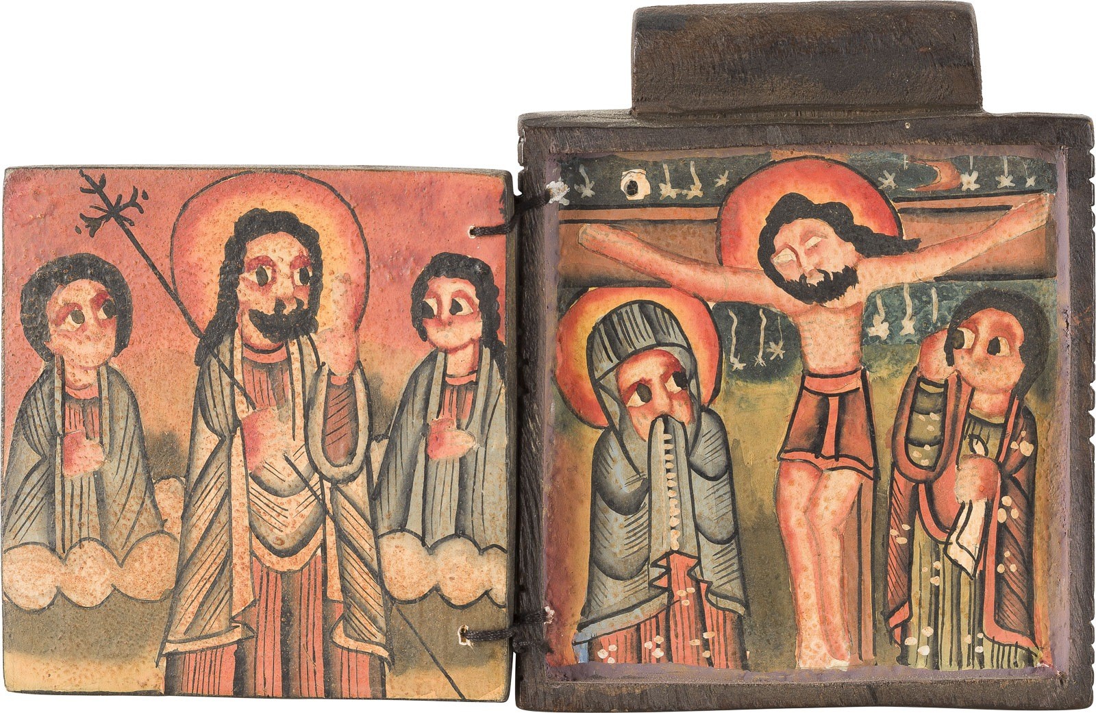 A COPTIC DIPTYCH SHOWING THE MOTHER OF GOD, THE CRUCIFIXION AND SAINTS Ethiopian, 20th century Tempera on wood panels. 10 x 14.5 cm (extended).