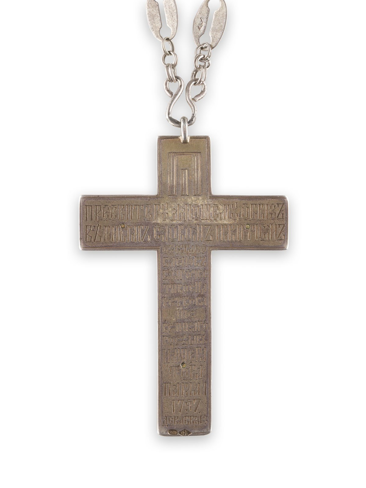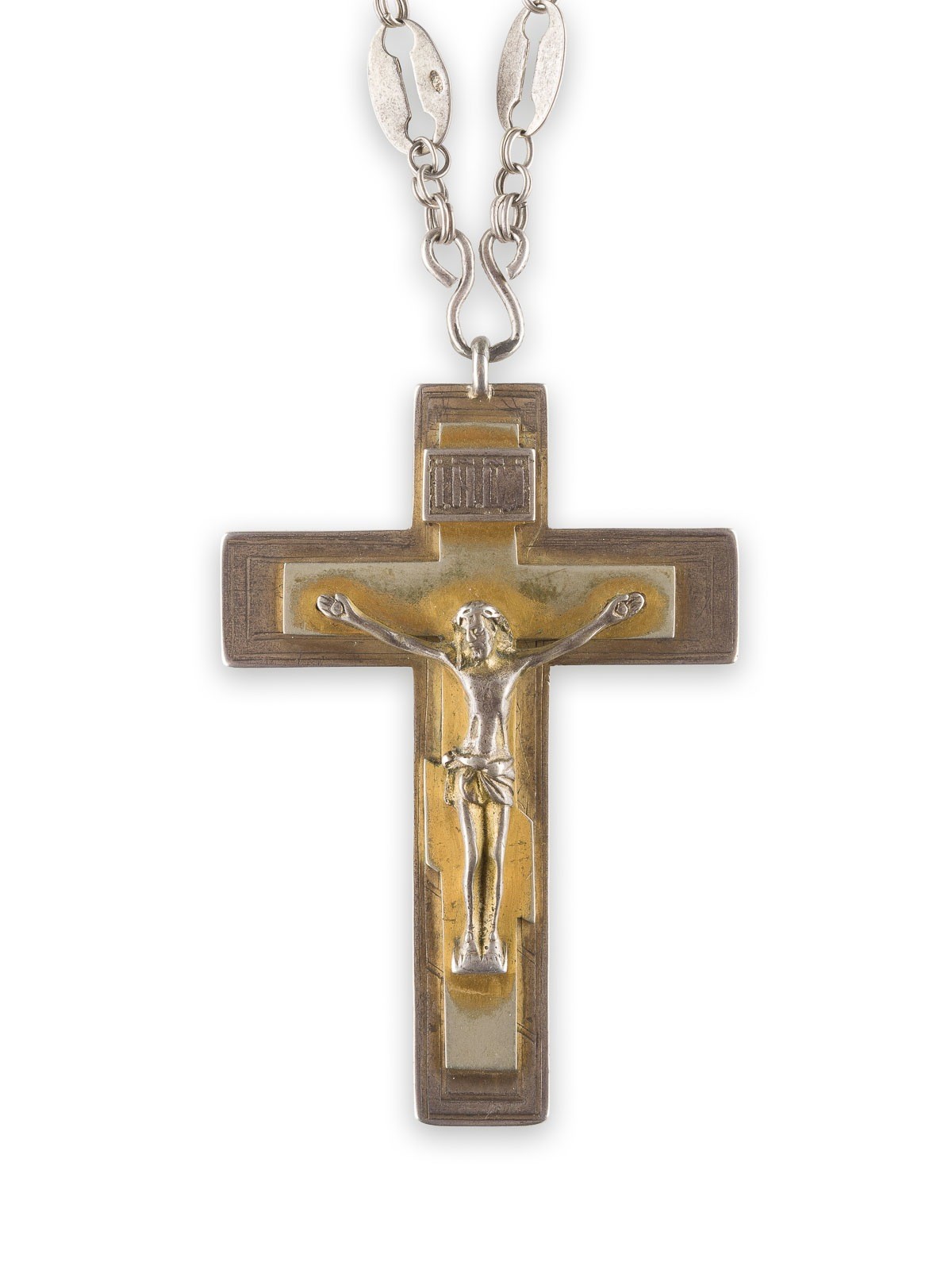 A SILVER-GILT PENDANT CROSS Russian, Moscow, Nikolai Vasilevitch Nemirov-Kolodkin, 1896-1908 The pendant cross set with the crucified Christ. The reverse engraved with Cyrillic inscription and Imperial cypher 'PI' in Cyrillic, dated '1797'. Marked with assayer's mark, 84 standard and master's mark 'N.K.' in Cyrillic. 11 cm high (without chain), 185 gr.