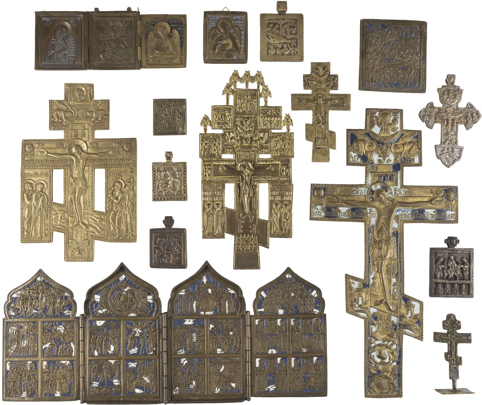 A COLLECTION OF 15 BRASS ICONS DEPICTING CRUCIFIXES, DEISIS, SELECTED SAINTS AND LITURGICAL FEASTS Russian, 17th-20th century Cast in relief, partially multi-coloured enamelled. Enamel part. chipped. 4.8-37 cm high.