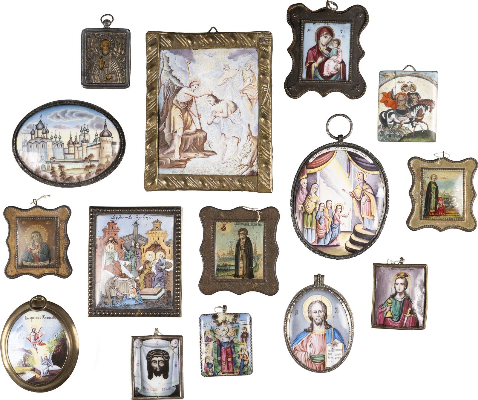 A COLLECTION OF 15 ICONS DEPICTING SELECTED SAINTS, LITURGICAL FEASTS AND A CITY LANDSCAPE Russian, including Rostov, 19th century Enamel/print on copper, part. silver mounted, oil on wood panel with velvet backing, overlaid with silver oklad. Part. marked with city hallmark, assayer's mark, 84 standard and master´s marks. Part. chipped. 5.5-12.4 cm high.