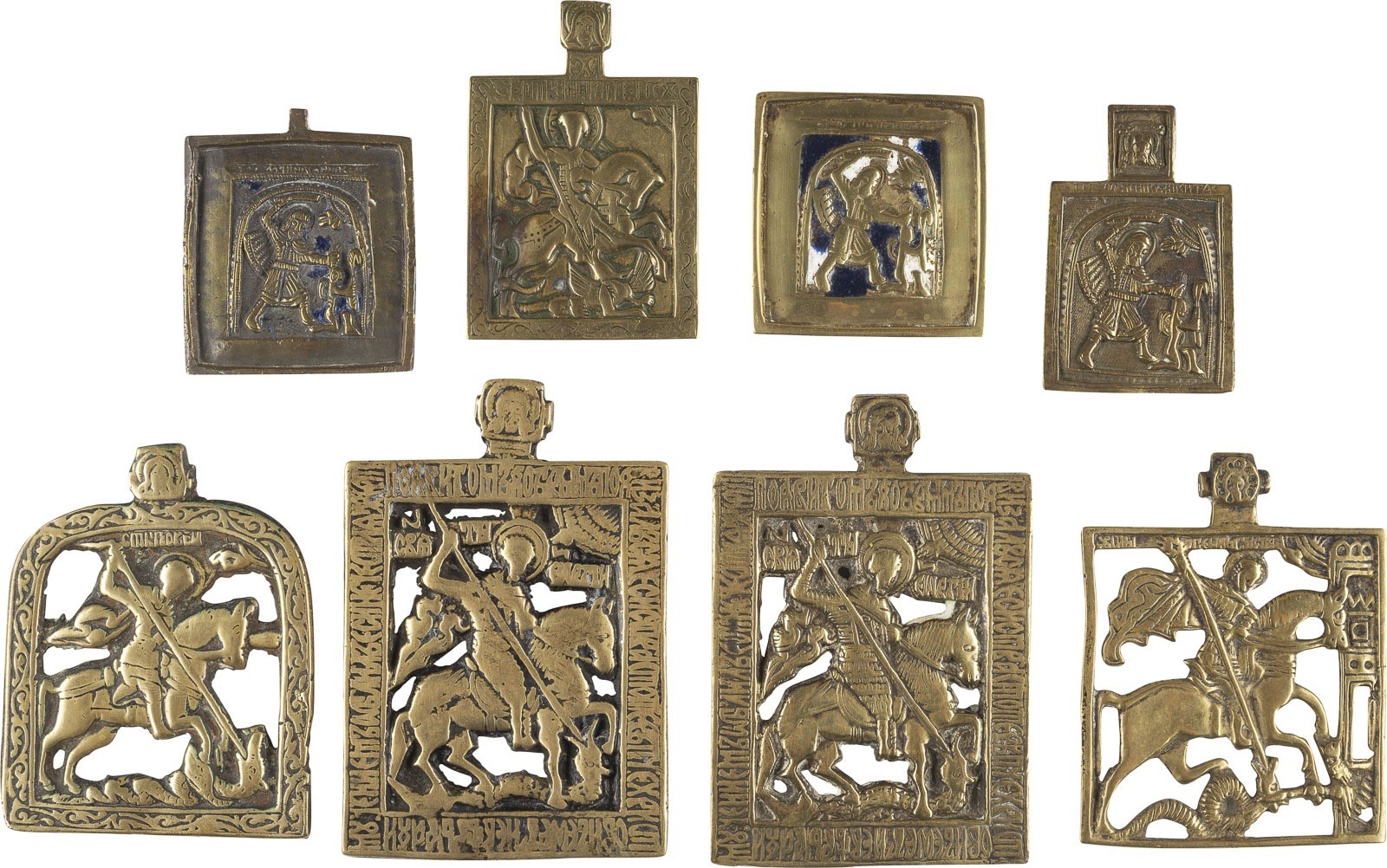 A COLLECTION OF EIGHT BRASS ICONS DEPICTING ST. GEORGE, KILLING THE DRAGON AND ST. NIKITA Russian, 17th-19th century Cast in relief, partially enamelled in blue and white. Enamel chipped. 5.6-10.7 cm high.