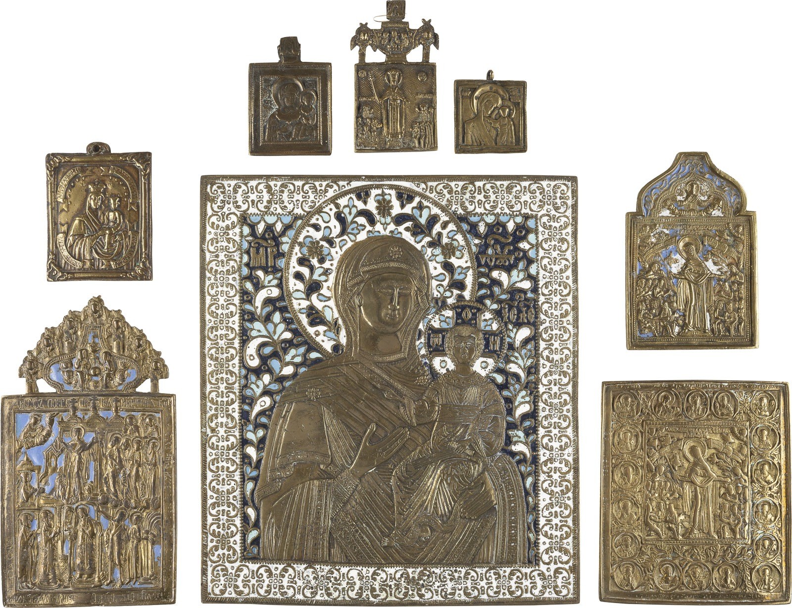 A COLLECTION OF EIGHT BRASS ICONS DEPICTING THE IMAGES OF THE MOTHER OF GOD Russian, 17th-20th century Cast in relief, partially multi-coloured enamelled. Enamel part. chipped, an icon showing the Mother of God 'Joy to all who grieve' min. bent at the top. 5.3-26.7 cm high.