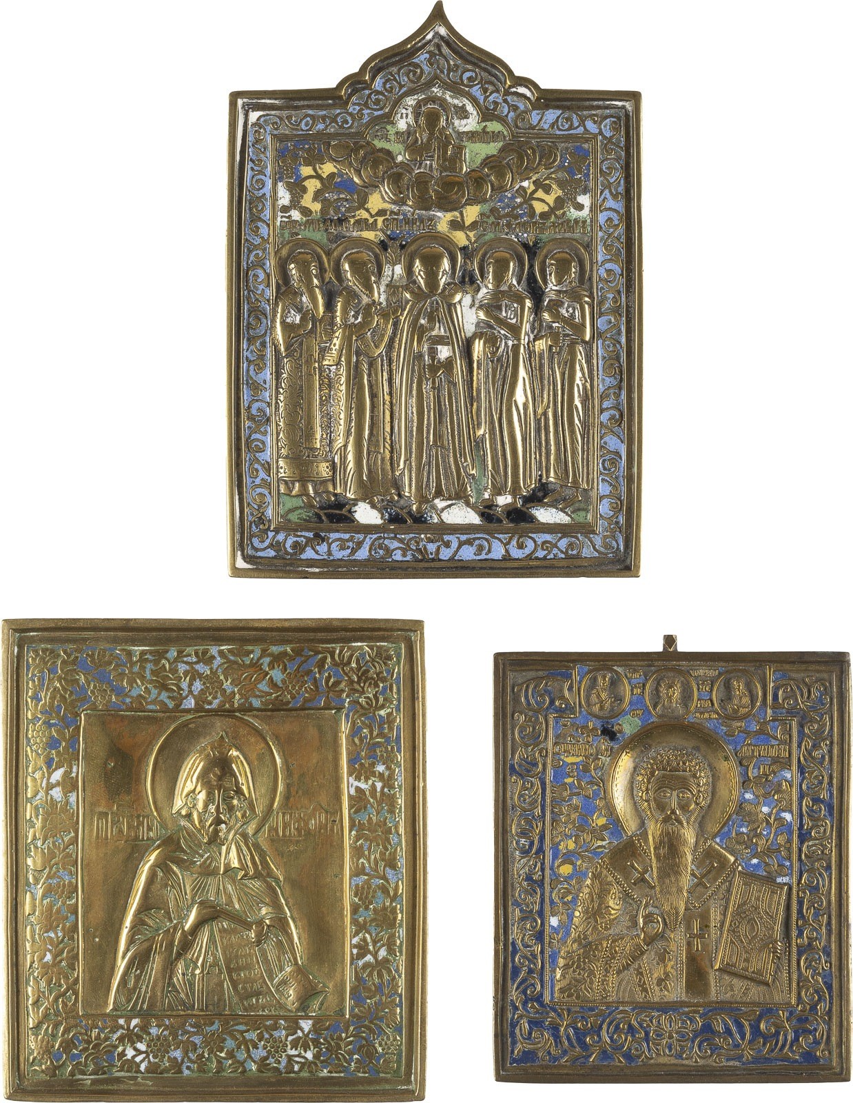 A COLLECTION OF THREE BRASS AND ENAMEL ICONS SHOWING SELECTED SAINTS Russian, 19th century Cast in relief, four- or six-colour enamelled. Enamel min. chipped. 11-14.5 cm high.