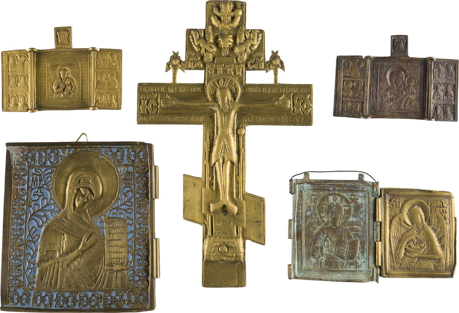 SAMMLUNG VON FÜNF BRONZE-IKONEN: KRUZIFIX, DARSTELLUNGEN CHRISTI UND DER GOTTESMUTTER SOWIE HEILIGER ANTIPAS