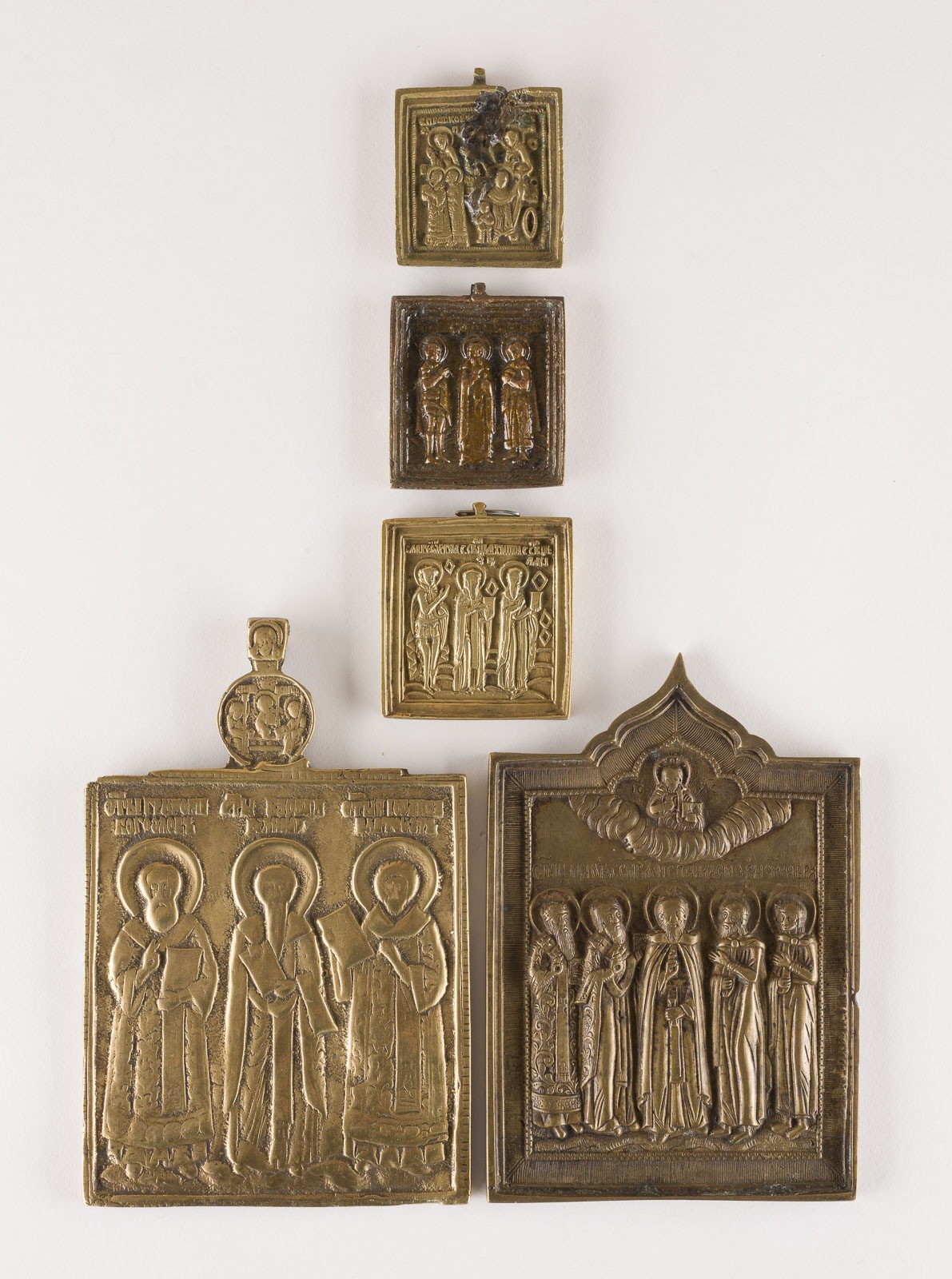A COLLECTION OF FIVE BRASS ICONS SHOWING SELECTED SAINTS Russian, 17th/19th century Cast in relief. One icon dam. above. 6-16.6 cm high.
