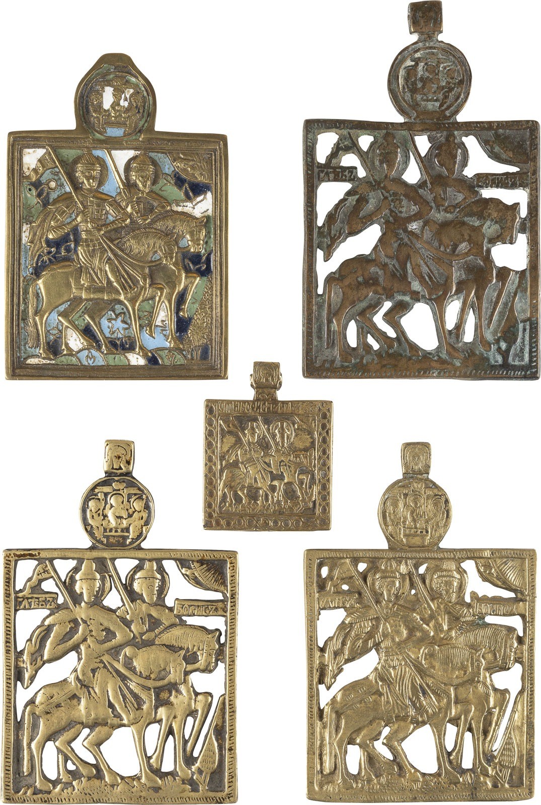 A COLLECTION OF FIVE BRASS ICONS SHOWING STS. BORIS AND GLEB Russian, 17th-19th century Cast in relief, partially four-colour enamelled. Enamel very slightly chipped. 6.6-14.8 cm high.