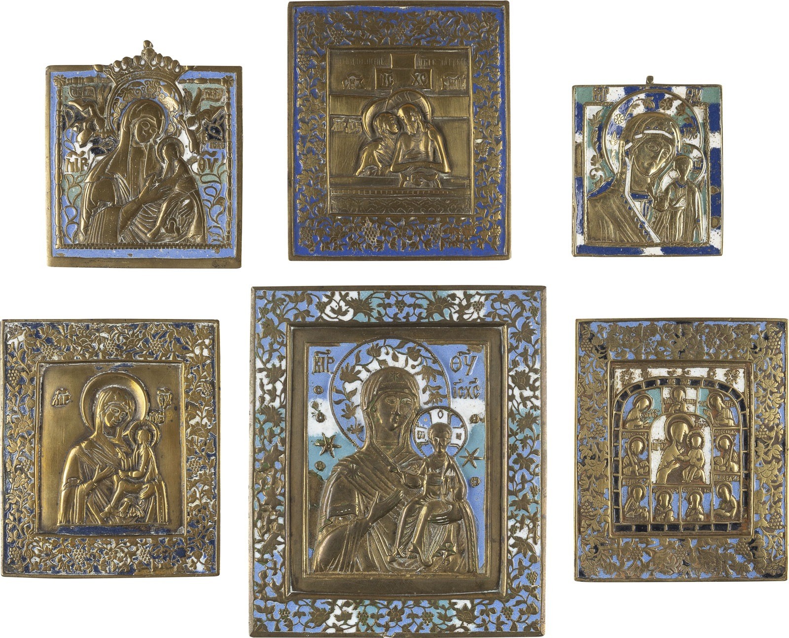 A COLLECTION OF SIX BRASS AND ENAMEL ICONS DEPICTING IMAGES OF THE MOTHER OF GOD Russian, 18th/19th century Cast in relief, multi-coloured enamelled. Enamel part. chipped. 8.1-15.7 cm high.