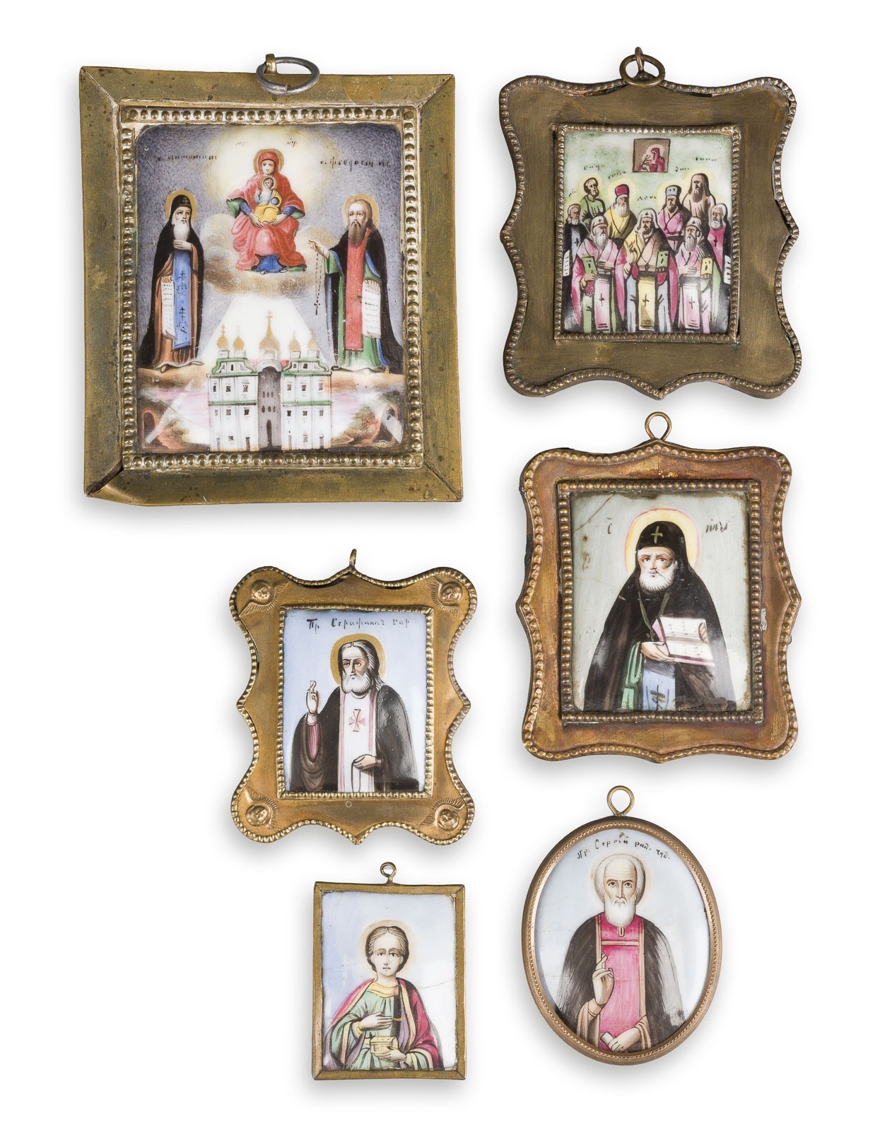 A COLLECTION OF SIX ENAMEL ICON PENDANTS (FINIFITI) SHOWING THE MOTHER OF GOD OF THE KIEV CAVES AND SELECTED SAINTS Russian, Rostov, 19th century / after 1903 Painted on metal. Metal-mounted. Damages, restored. 4-9.3 cm high.